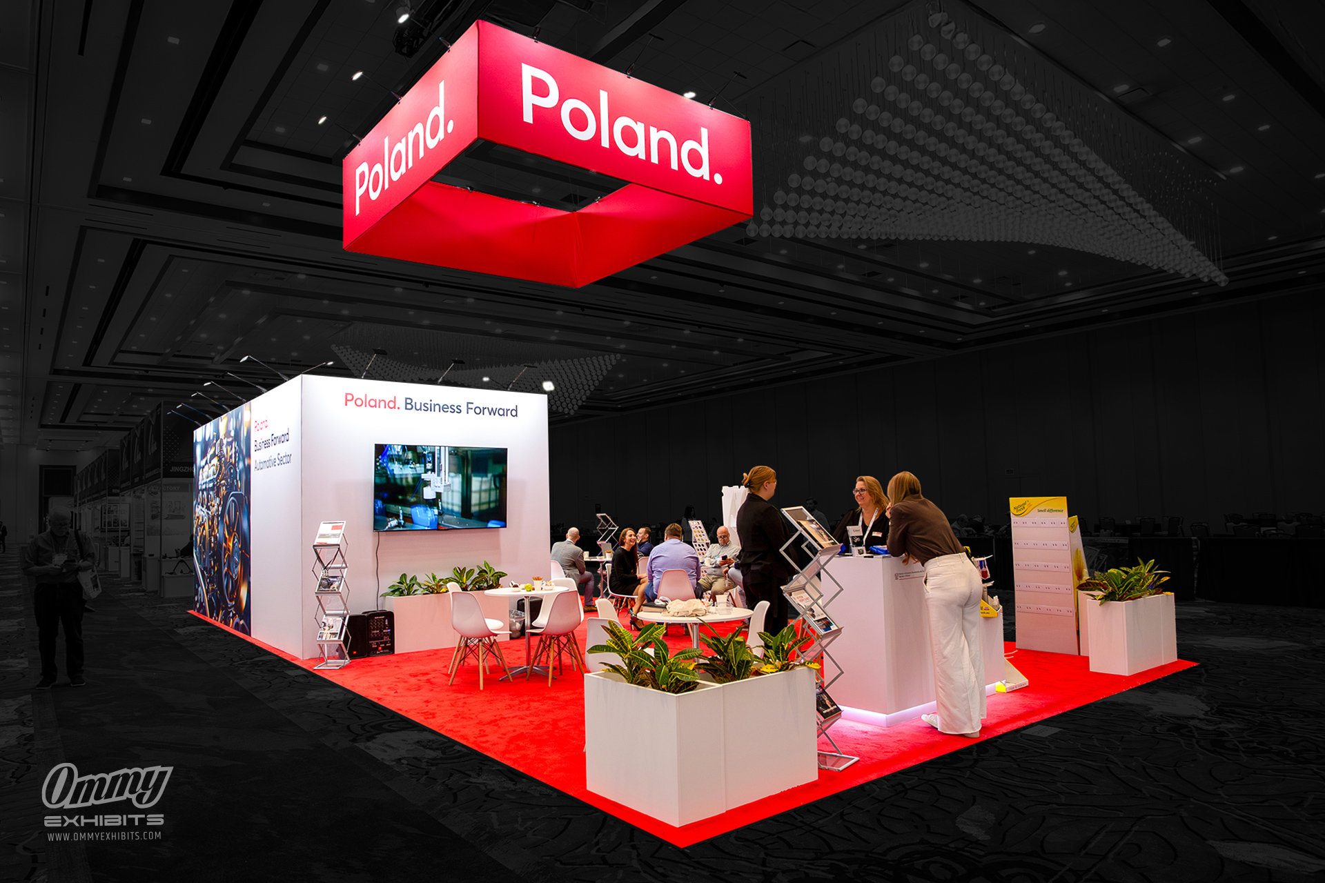 At trade shows like AAPEX, a well-designed booth draws visitors and supports business goals. For the Polish Investment and Trade Agency, Ommy Exhibits created a 20×40 space that balanced openness with functionality. The layout featured an open design. Multiple tables and chairs formed dedicated meeting spots. Moreover, a reception cabinet at the front welcomed guests with a professional feel.