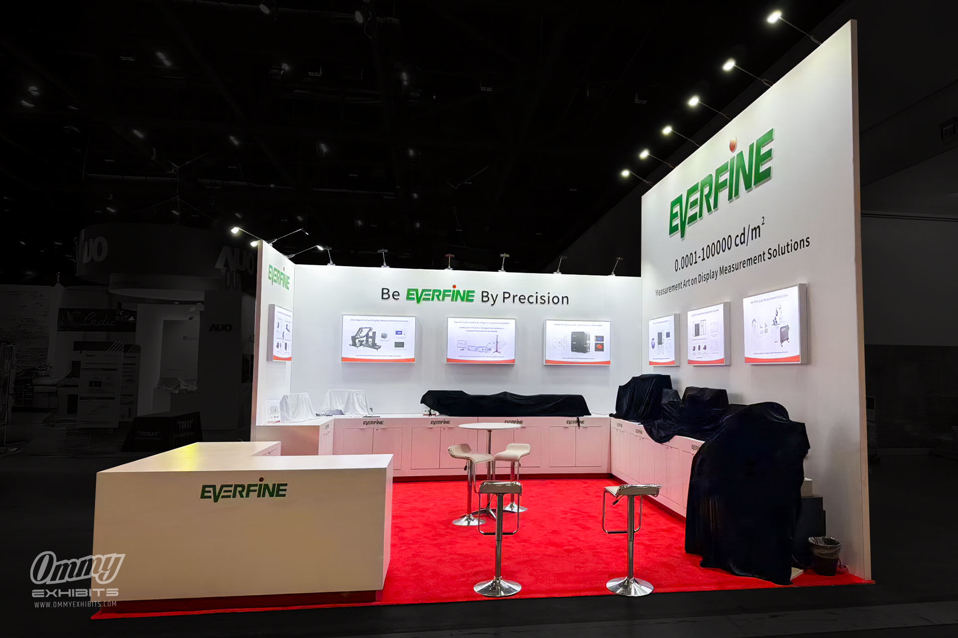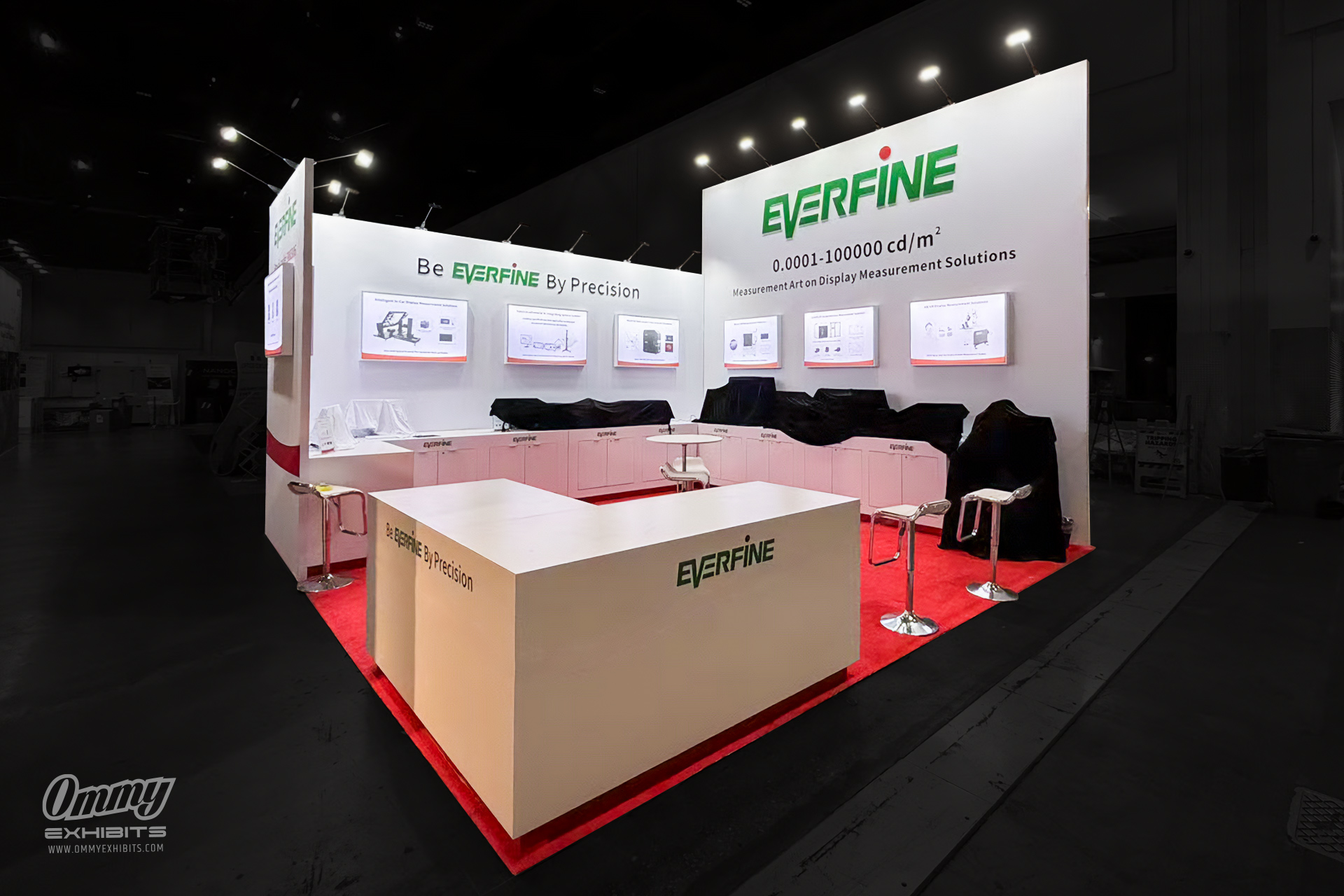 Ommy Exhibits proudly partnered with Everfine, a leader in intelligent detection technology, to build a 20’x20′ booth for Display Week 2025 (SID), a premier global event for display technology professionals. Specifically, our team engineered the booth to embody Everfine’s commitment to precision and innovation, actively weaving their brand identity into every element. For example, we prominently displayed Everfine’s slogan, “Be EVERFINE By Precision,” and logo across brightly lit inner and outer walls, creating a cohesive and professional aesthetic. Additionally, we positioned illuminated displays at eye level to highlight Everfine’s diverse LED and lighting measurement tools, while interactive demonstrations engaged attendees with hands-on experiences of cutting-edge technology, sparking interest and interaction.