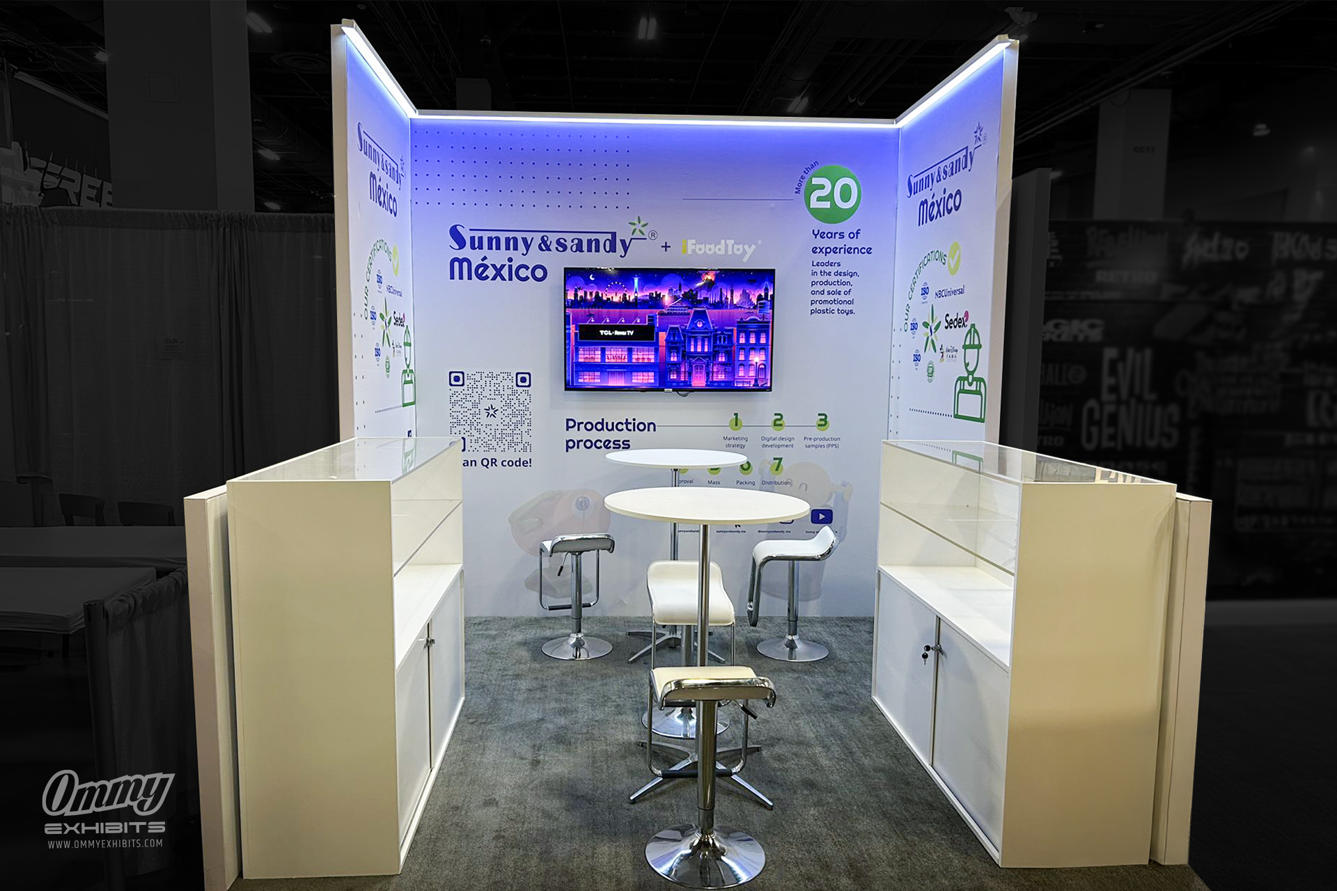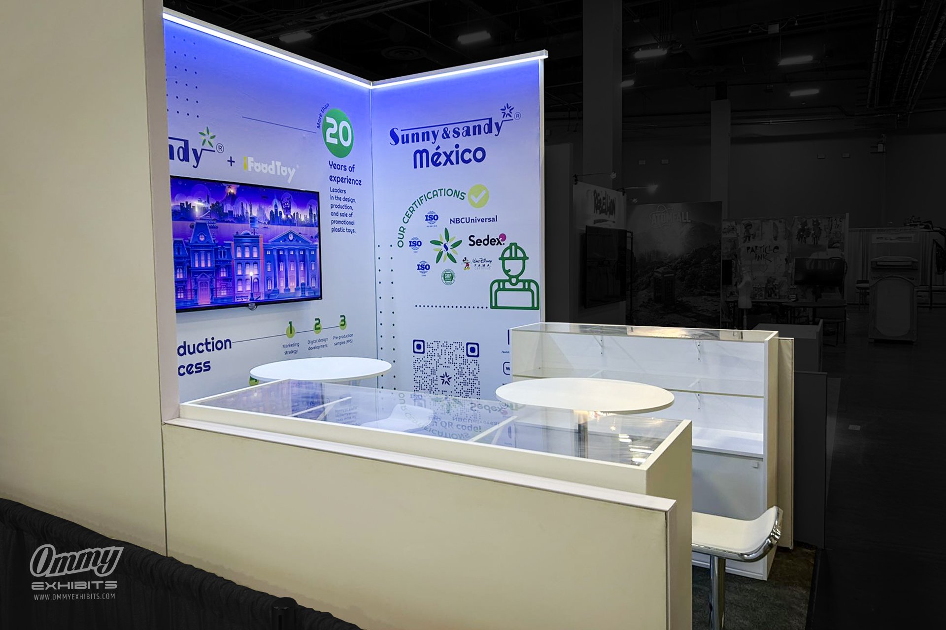 Moreover, Ommy Exhibits tailored the booth to maximize impact within a limited footprint. By incorporating clear signage, vibrant colors, and interactive elements, we ensured the booth communicated Sunny & Sandy’s expertise effectively. The result was a space that not only showcased their products but also fostered connections with potential partners. Consequently, the booth became a hub of activity, proving that size doesn’t limit influence. Ommy Exhibits is proud to have delivered this exceptional licensing trade show booth. We are eager to collaborate with your brand to create a custom booth that elevates your presence at your next event. Contact us today to discuss how we can bring your vision to life.
