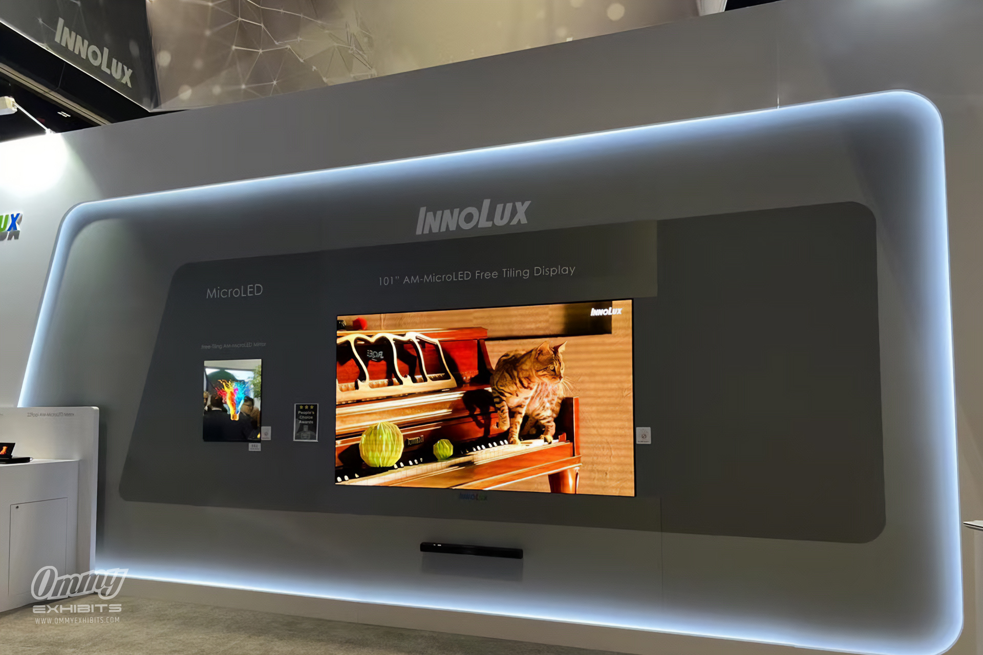 At Display Week 2025, InnoLux dazzled attendees with their impressive 20’x30′ booth. The elegant yet innovative design, crafted by Ommy Exhibits, served as a modern showcase. As a result, visitors could experience InnoLux’s latest technologies up close. These included the 85″ 4K AI Interactive InnoGallery Display and the remarkable 101″ AM-MicroLED Free Tiling Display. Additionally, the booth featured desktop monitors, laptop panels, and medical and automotive displays. Above all, the clean aesthetic and prominent hanging sign with the InnoLux logo helped the booth stand out on the busy trade show floor.