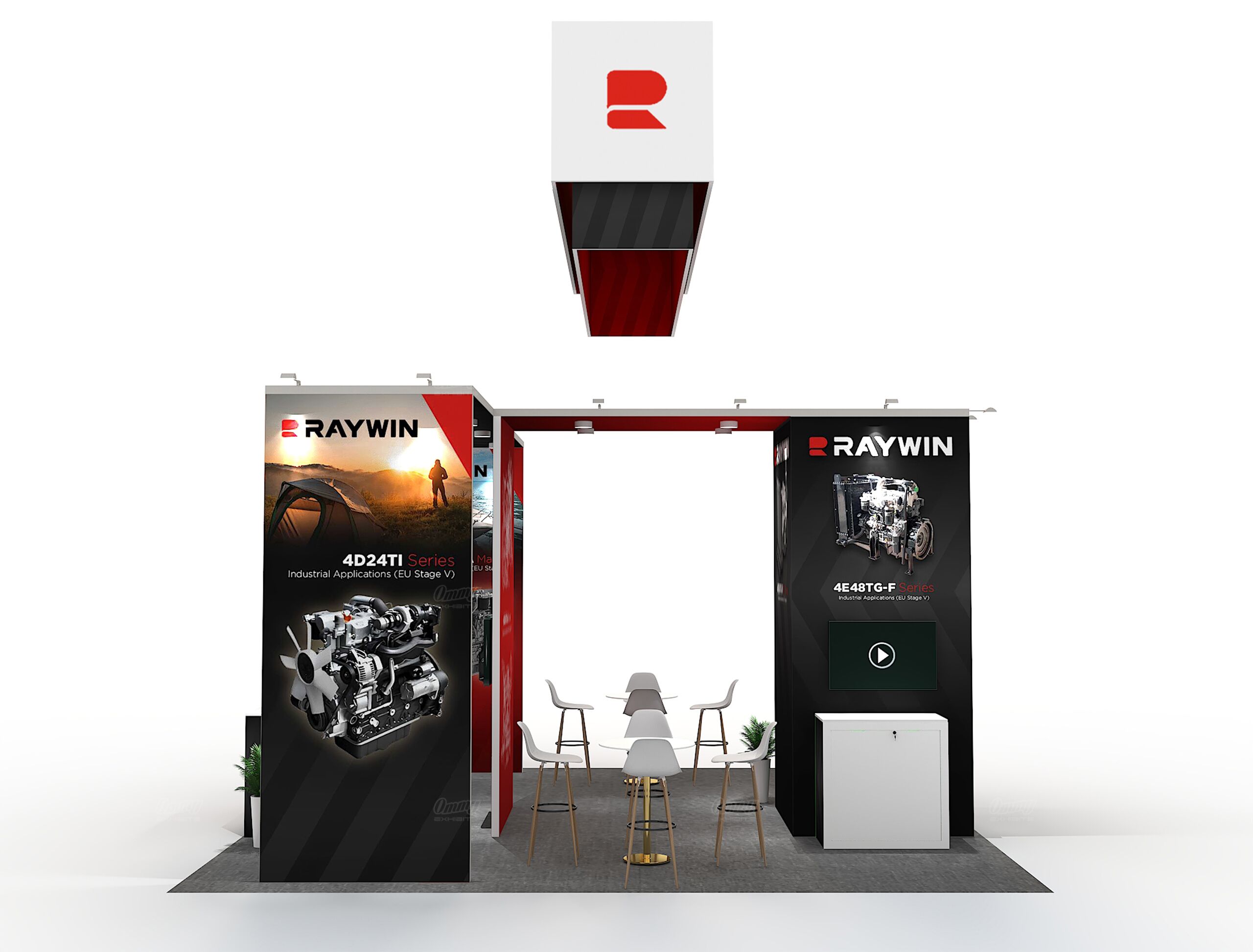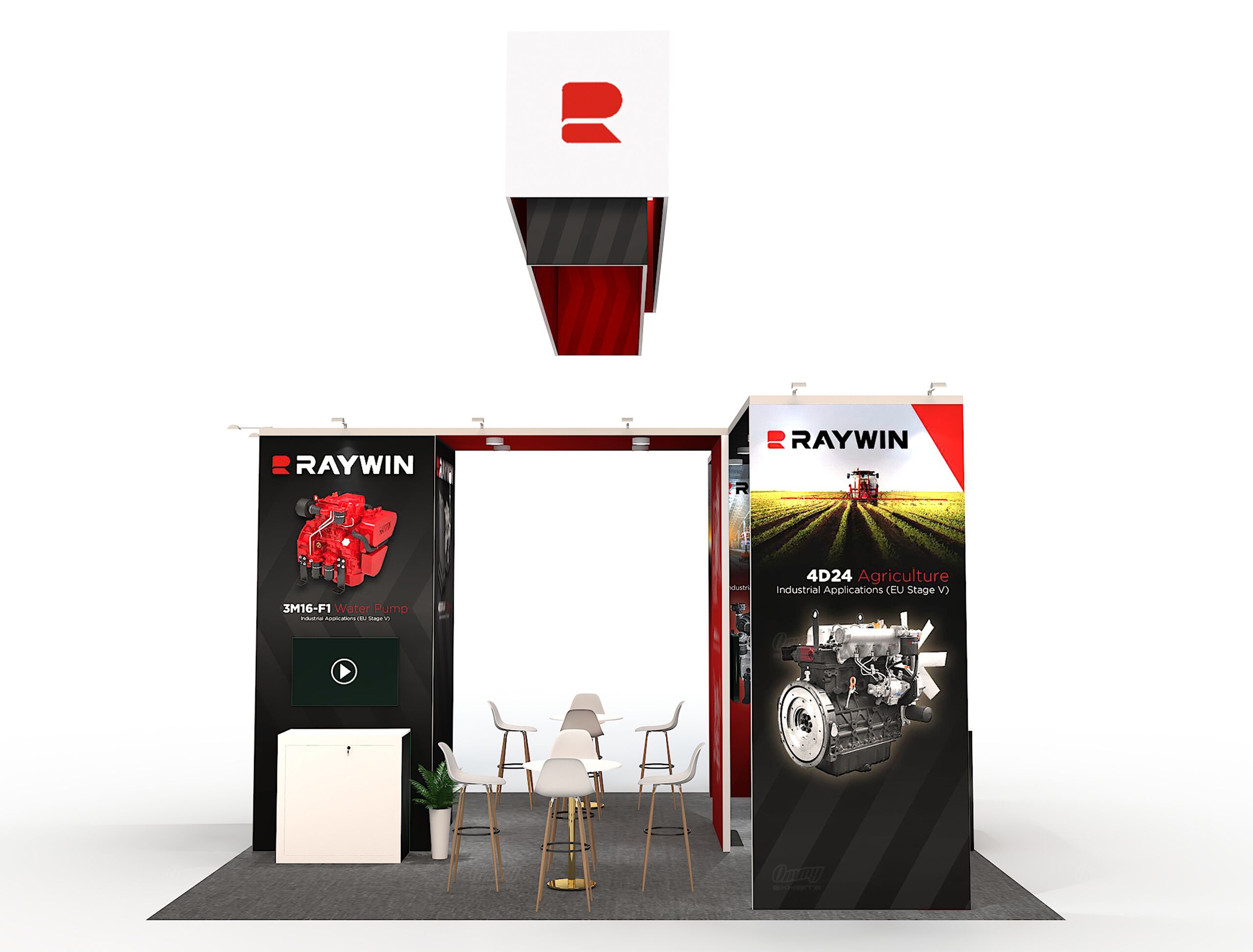 Maximize engagement with this versatile 20×20 T-shaped island exhibit. Designed for high traffic and visibility, this booth utilizes a prominent hanging sign to capture attention across the venue. Your content will shine on the three large video displays, while the two bar-height tables offer comfortable, casual seating for up to eight for meaningful conversations. Maintain a clean, professional look with the dedicated, private storage room integrated directly into the layout. This is the ideal solution for commanding presence and facilitating productive meetings.