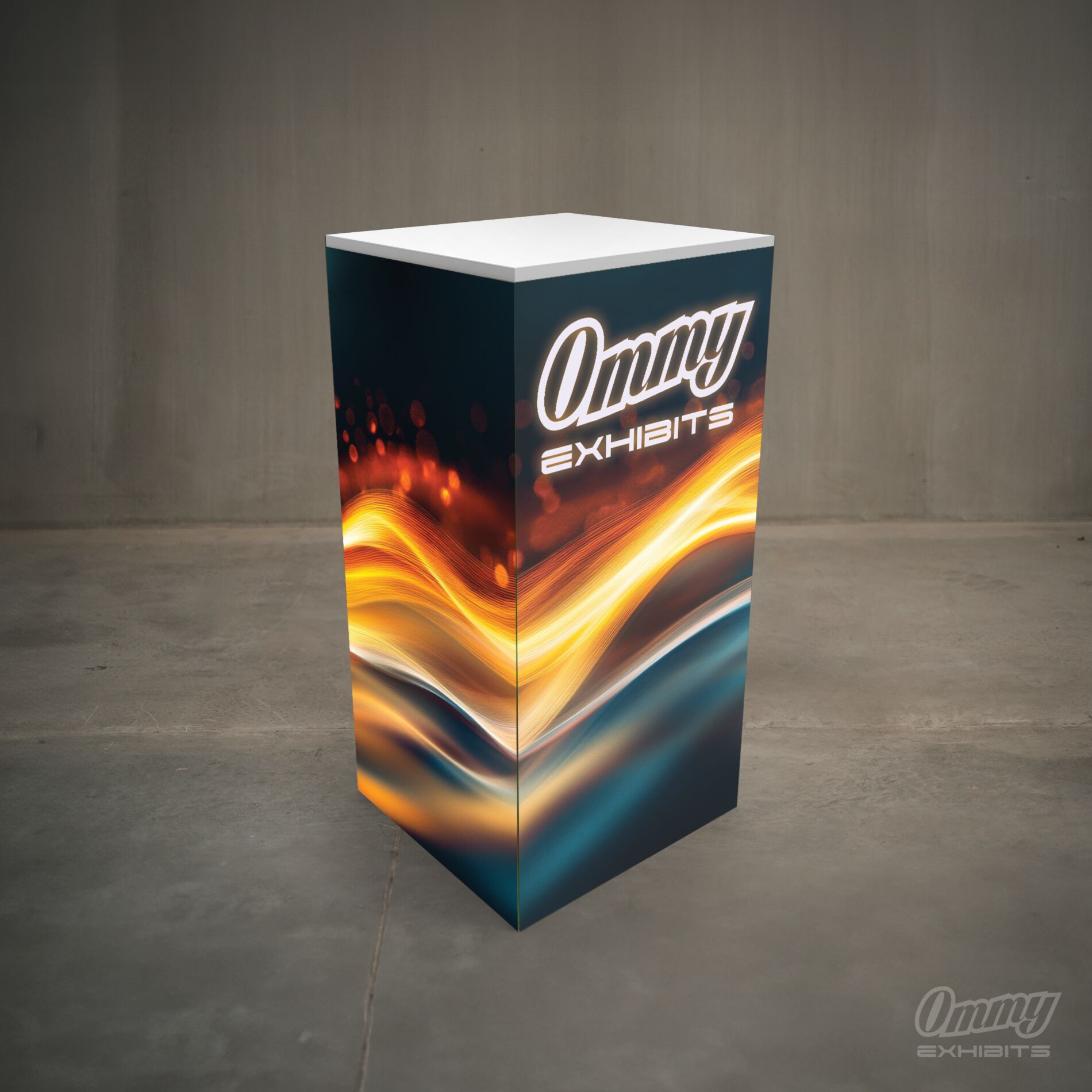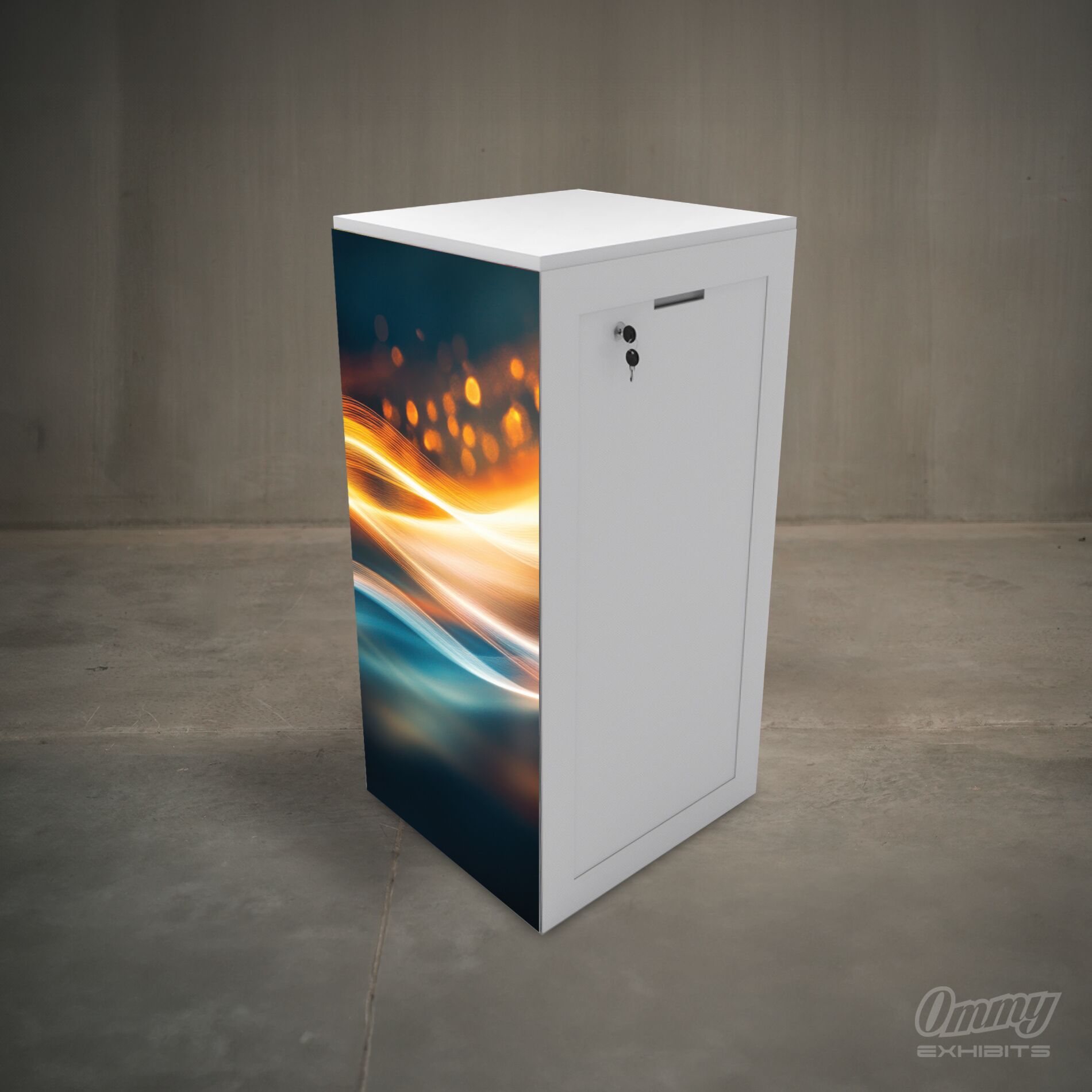 Small illuminated cabinet with lock. Includes custom, full-color graphics printed on fabric.