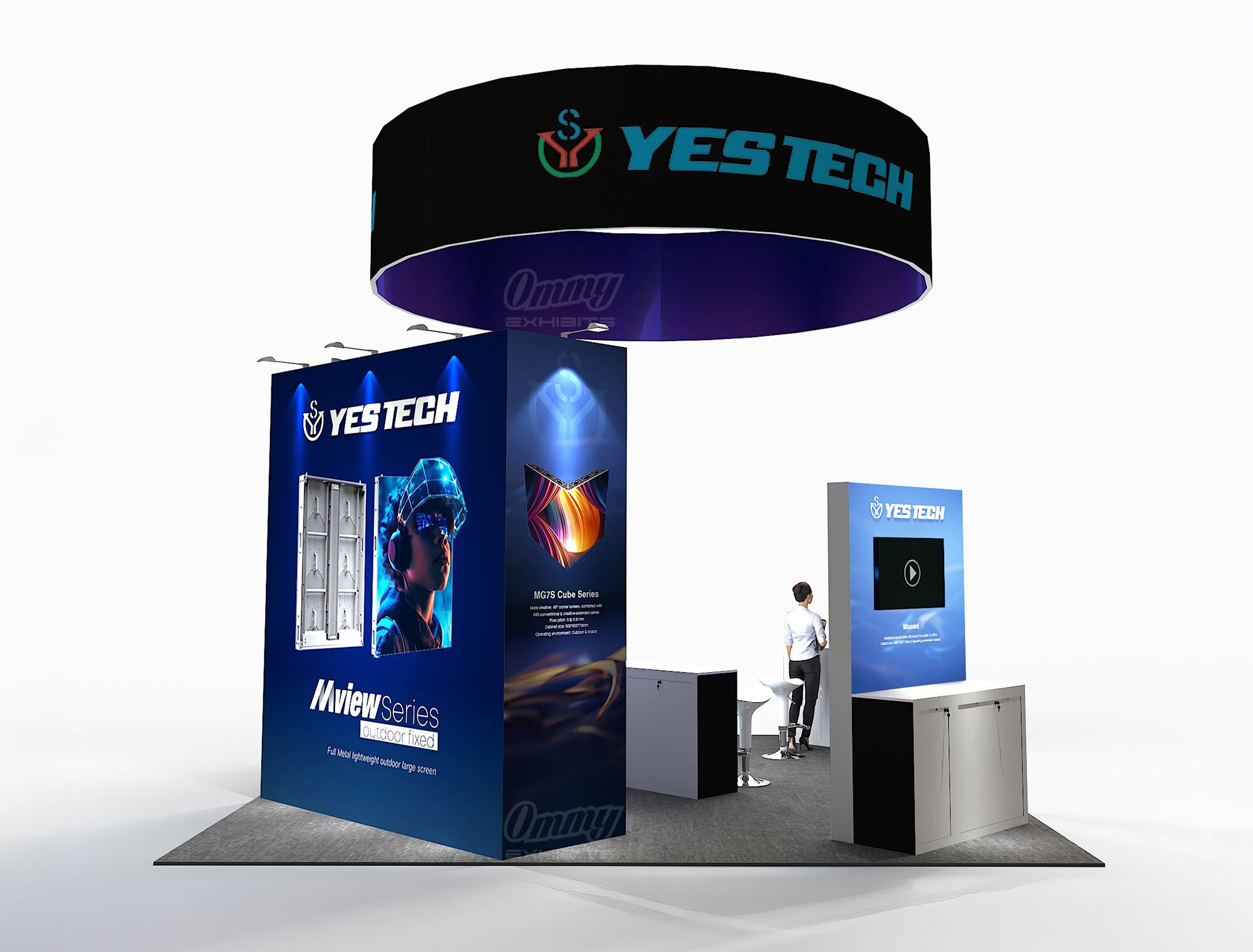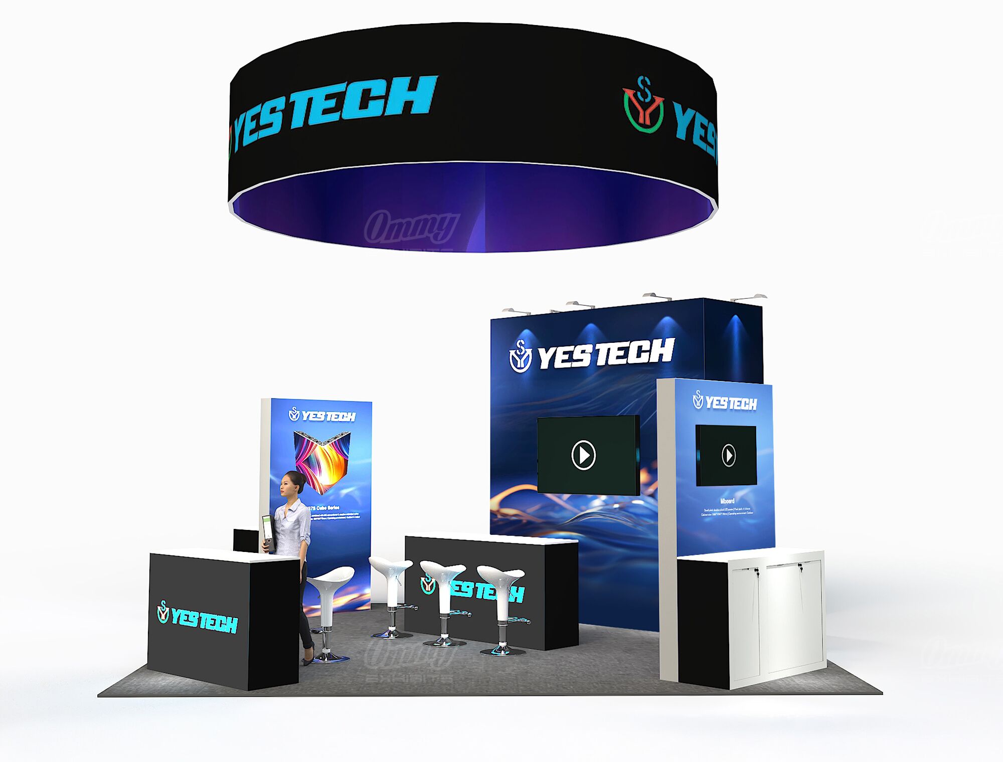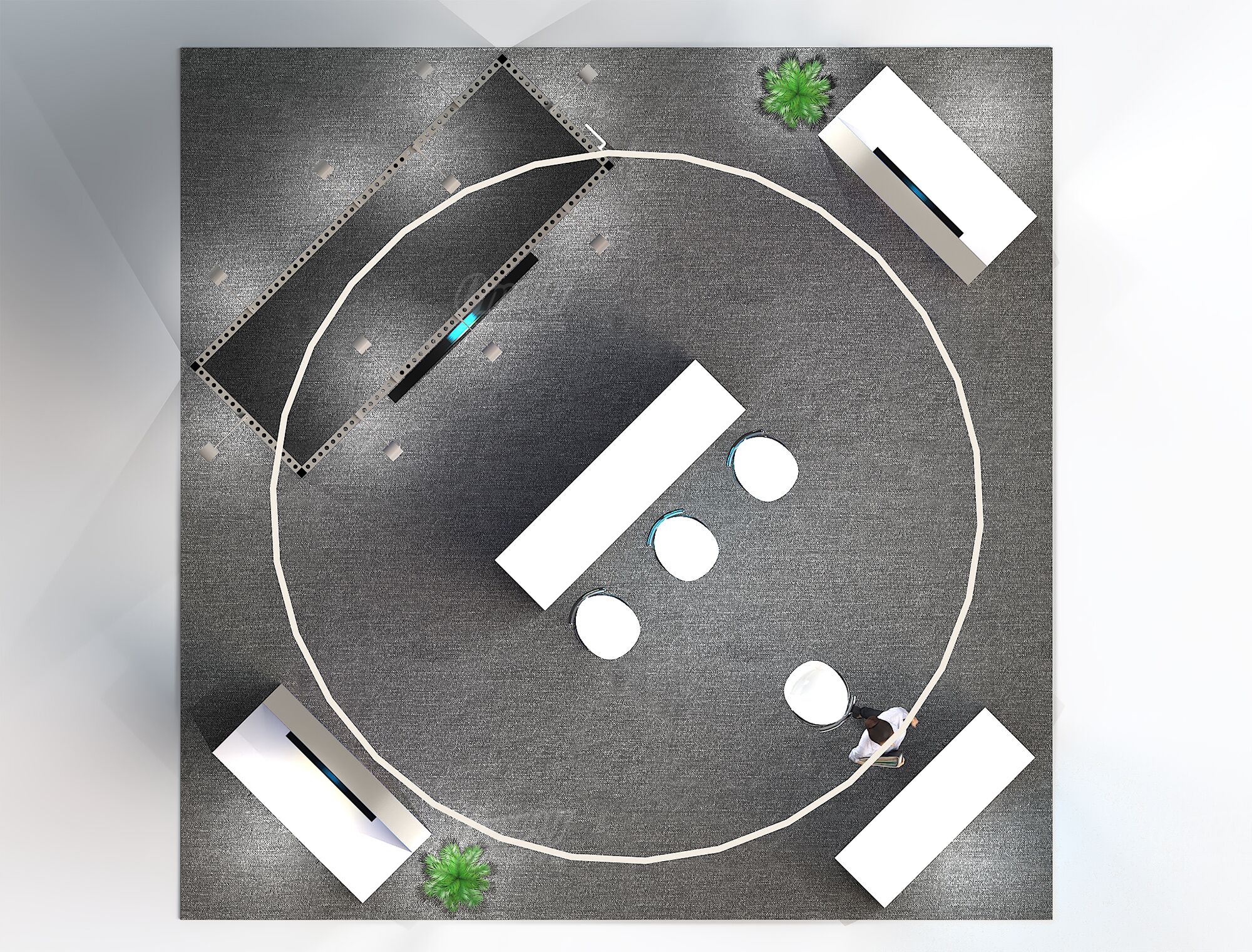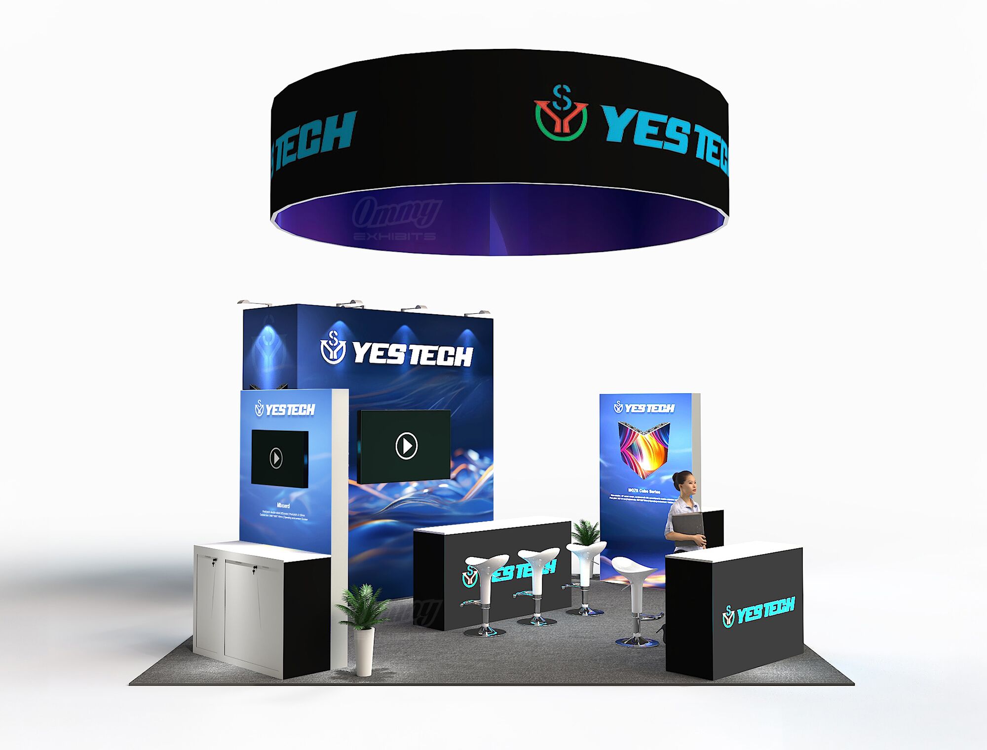 Project a sleek, modern image with this bright 20×20 island exhibit. This booth guarantees superior visibility with an eye-catching cylindrical hanging sign and two brilliant light box stations for impactful graphics. The modern bar-style illuminated reception instantly welcomes visitors with a professional glow. Functionality is maximized with a dedicated, private storage room integrated directly into the design, keeping the exhibit clean and focused. This solution is perfect for a company looking to combine high-end design with efficient operation.