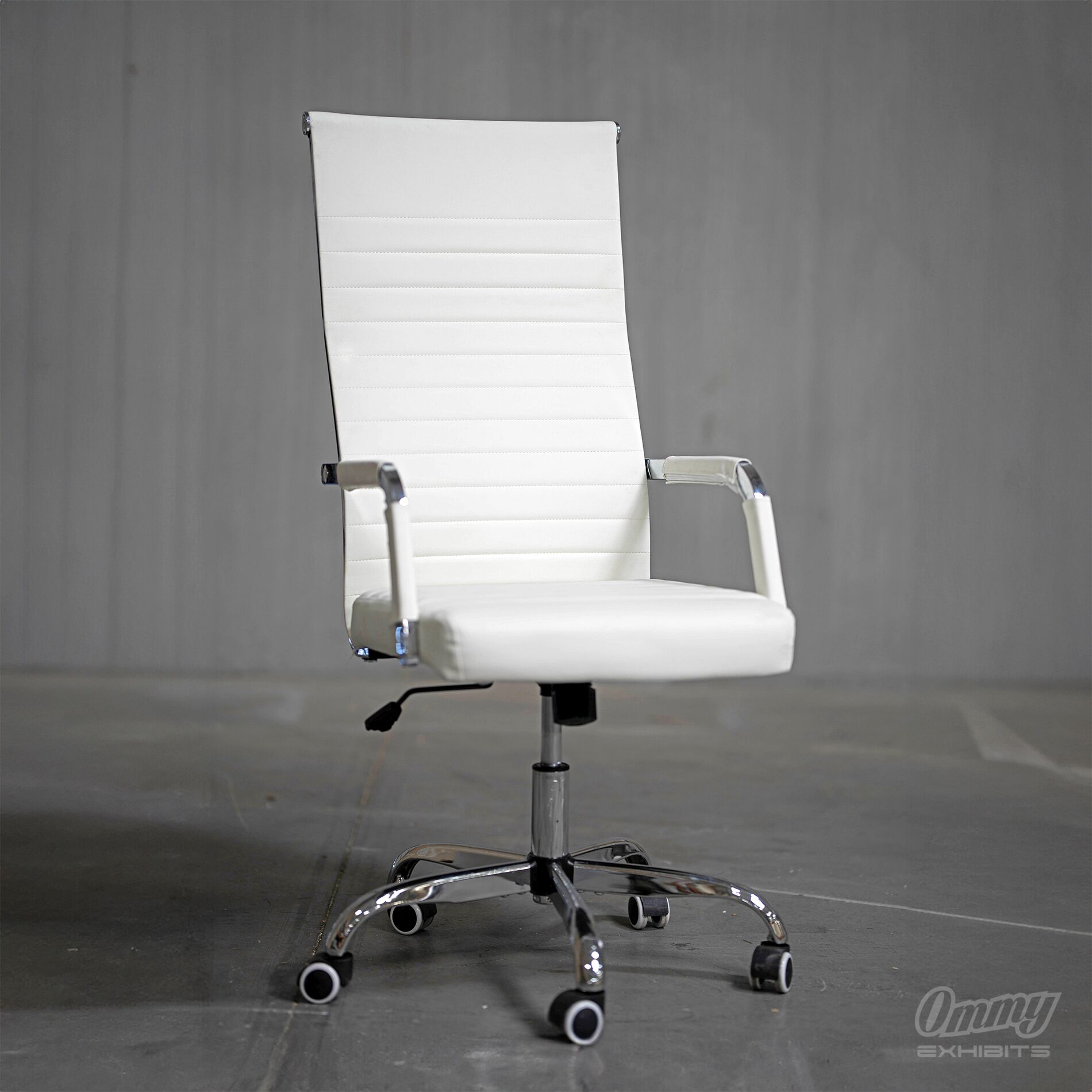 Modern white faux leather and chrome executive office chair.