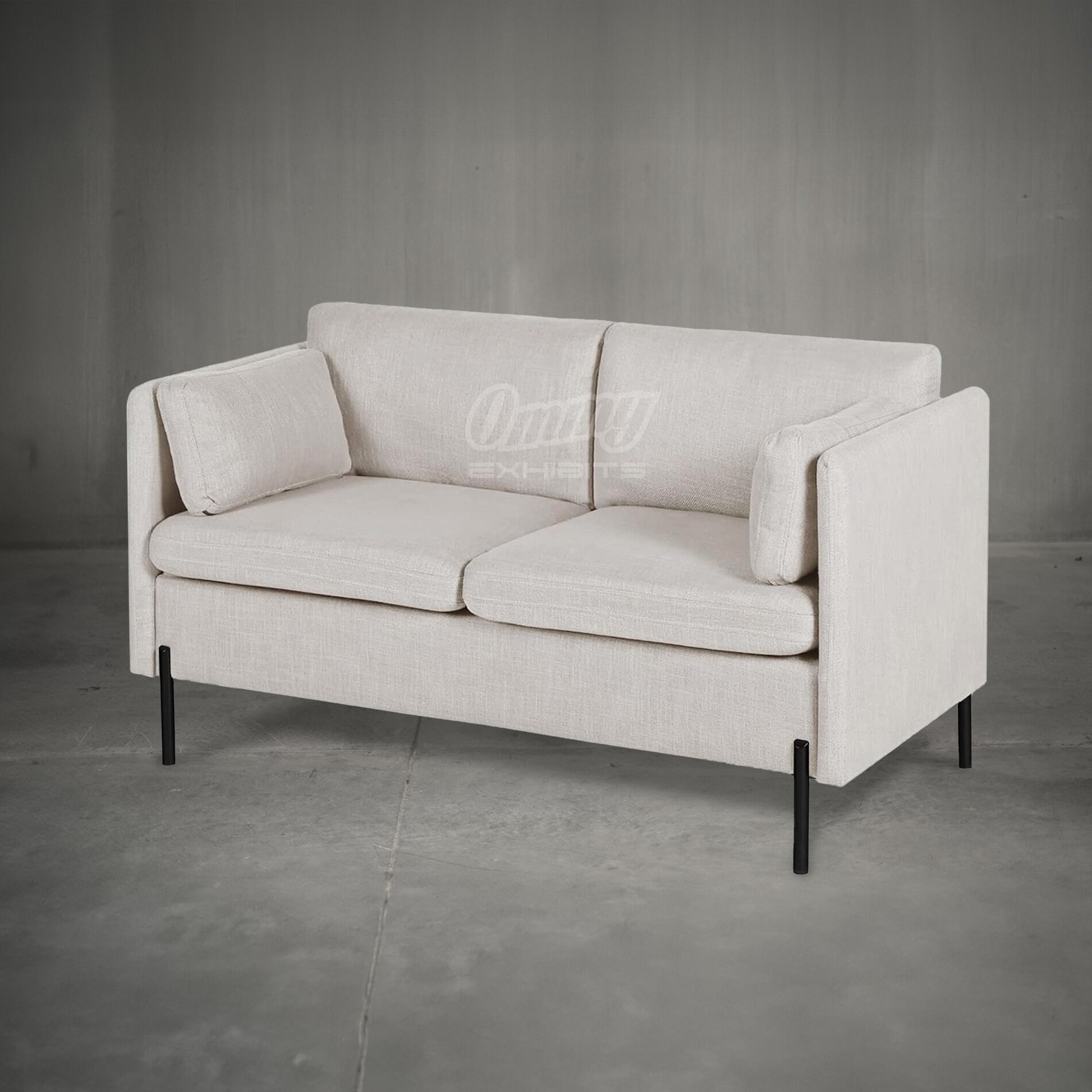 Modern beige fabric loveseat with black metal legs.
