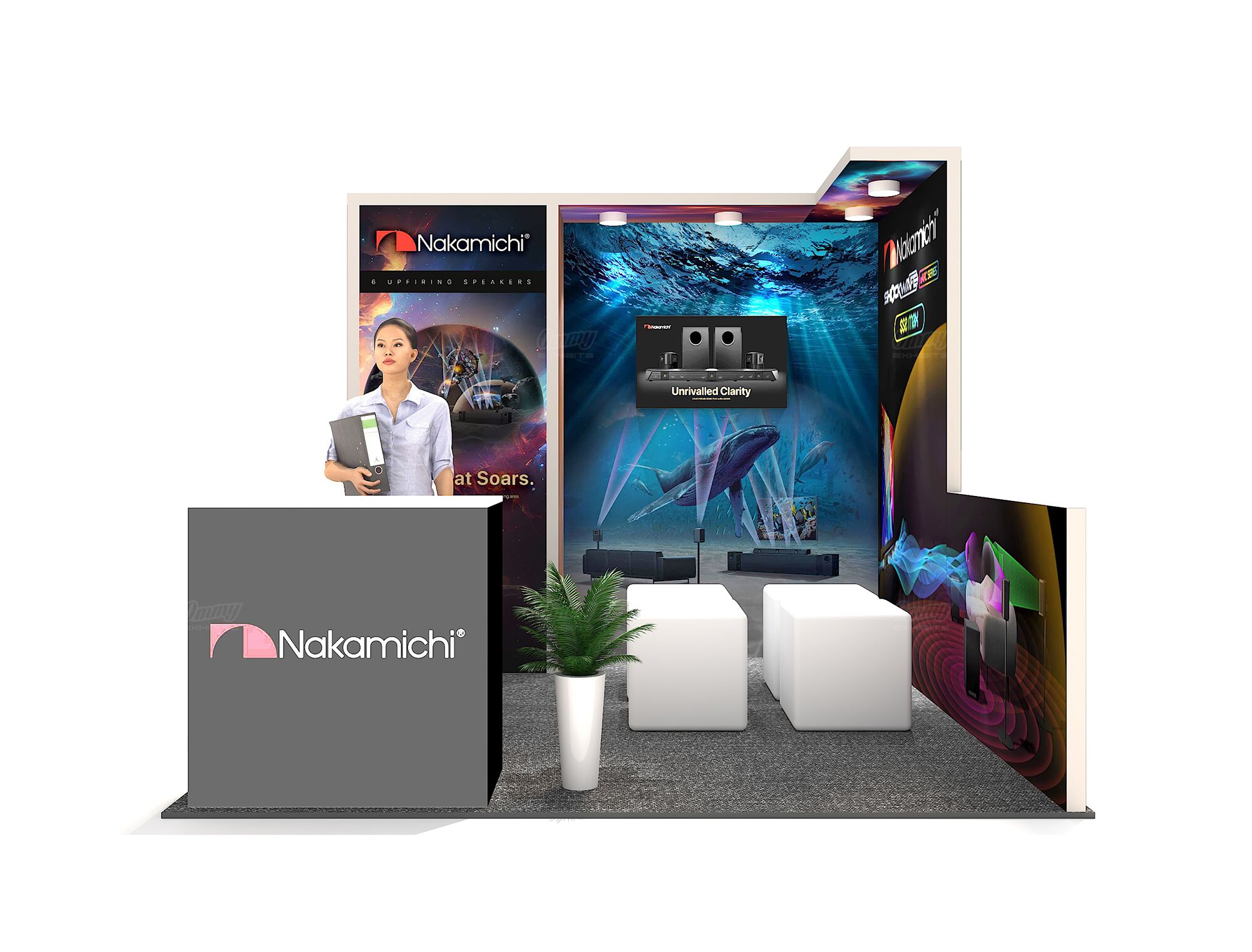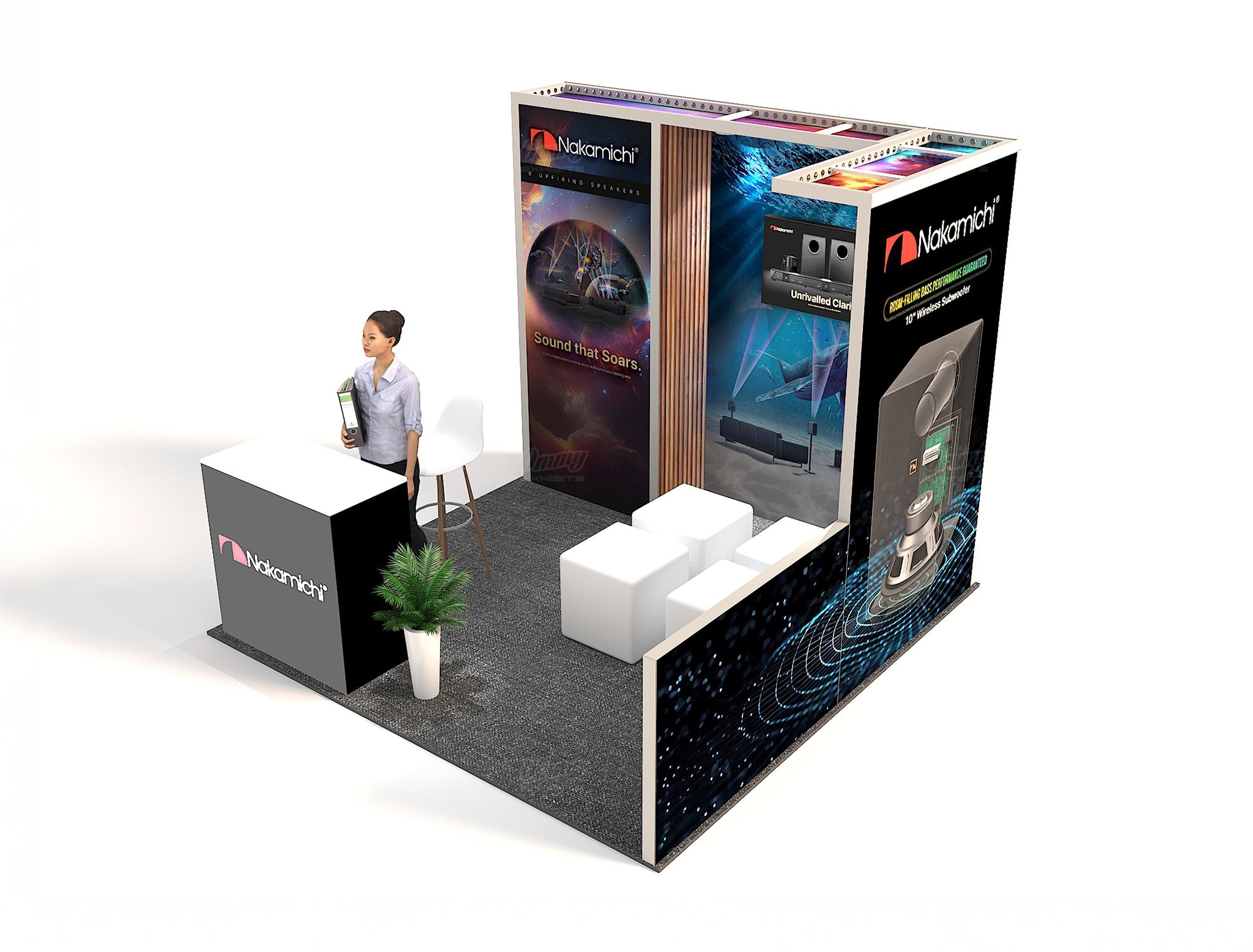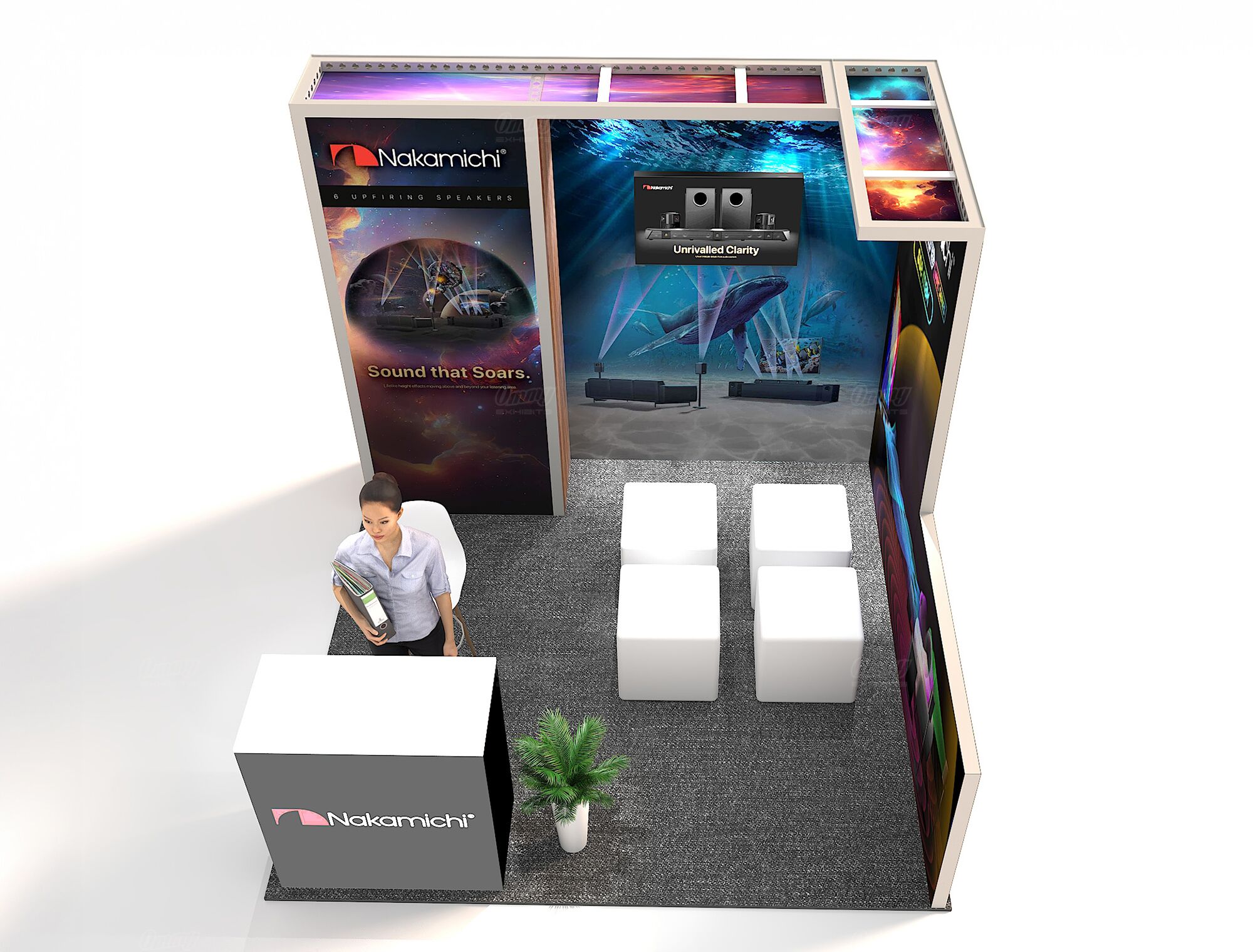 This compact yet powerful design features a full-color back wall and side graphics that showcase your brand from every angle, ensuring maximum visibility on a busy show floor. The integrated downlights keep your messaging bright and eye-catching, while the video display adds dynamic content that naturally draws attendees to your space. It’s a complete, turnkey solution that delivers professional impact without the complexity—just show up and start connecting with prospects.