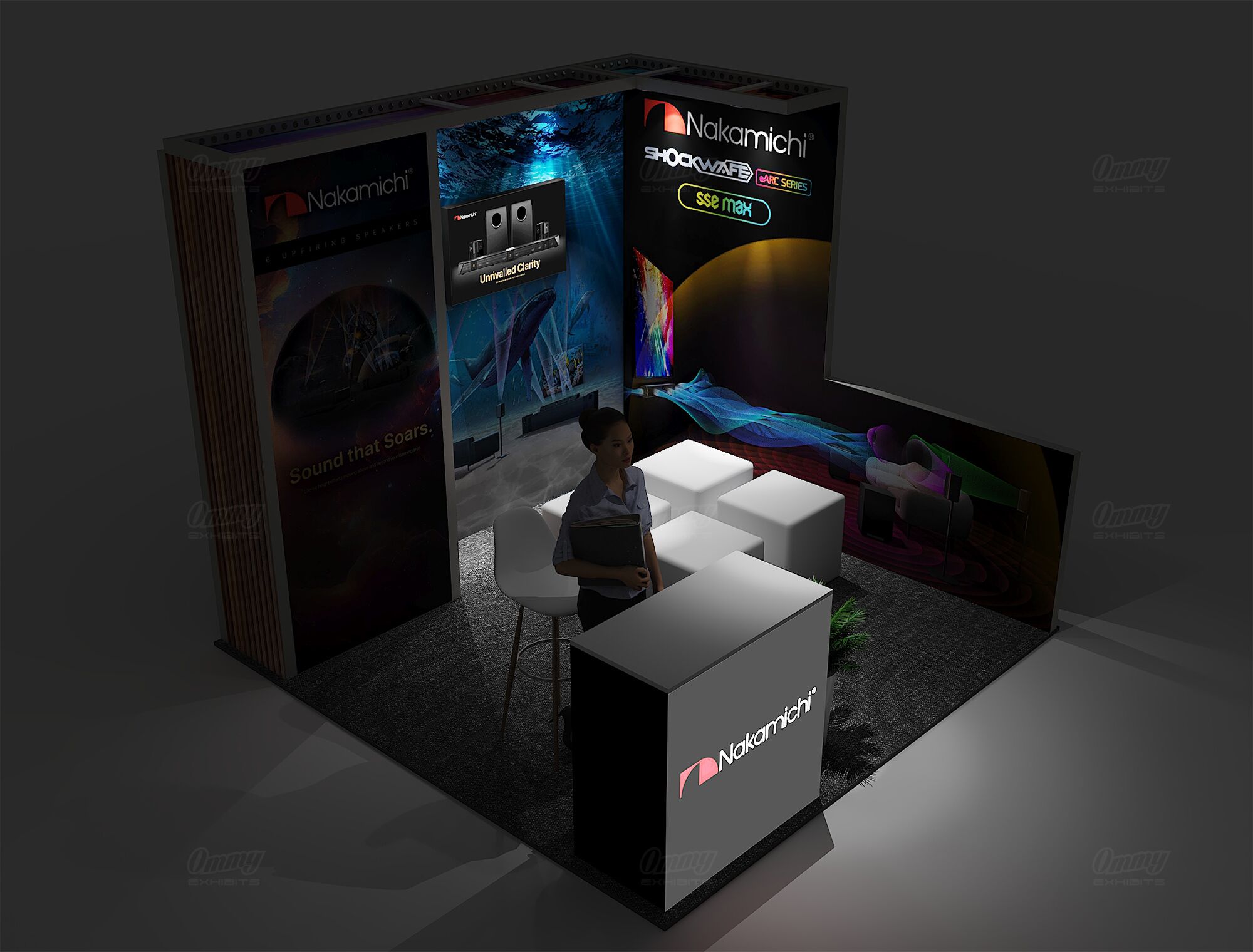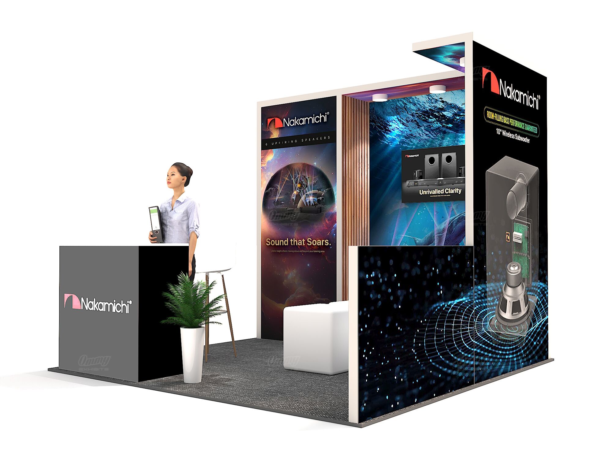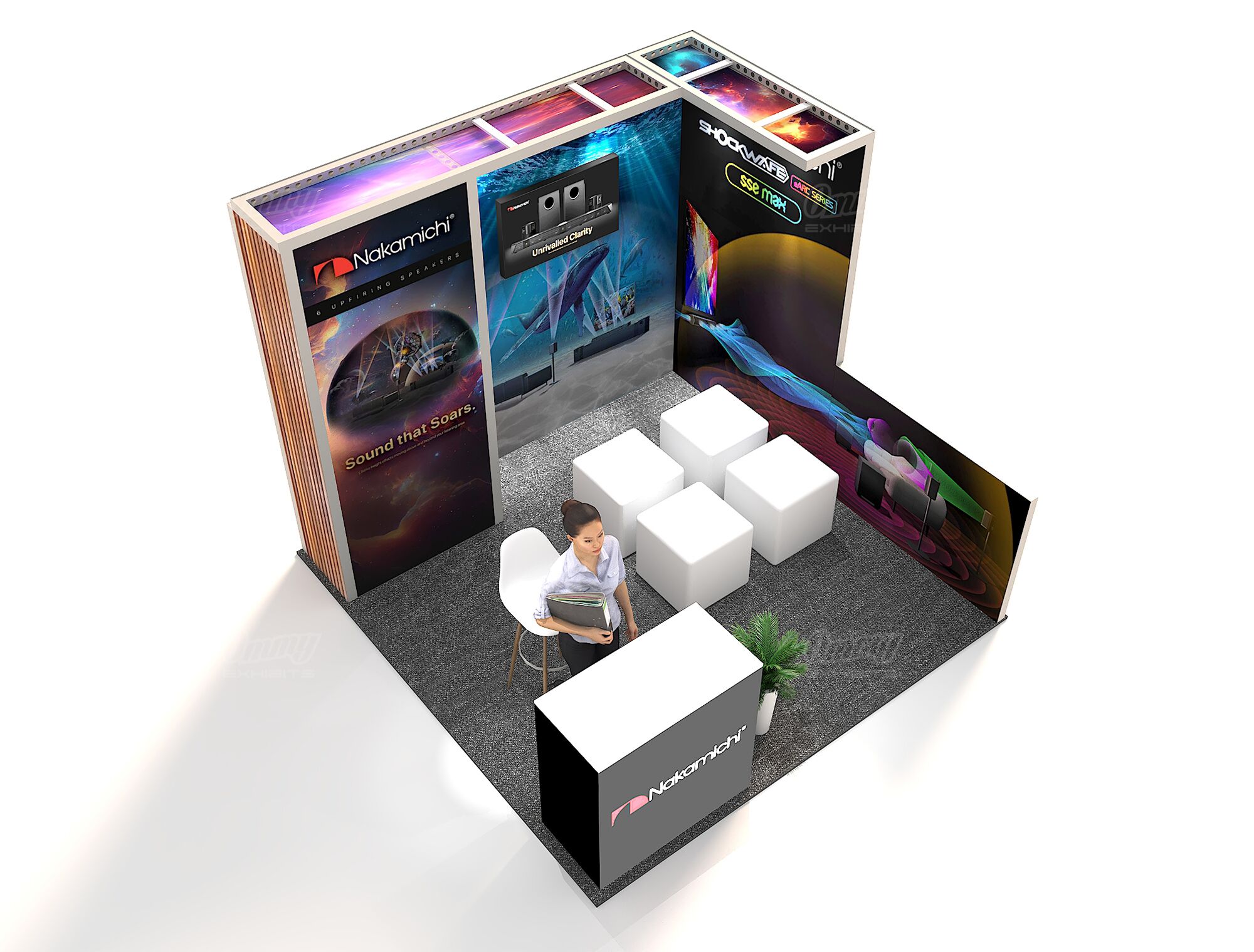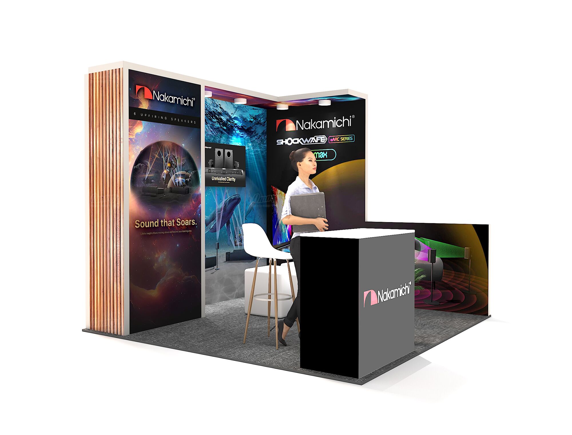 This compact yet powerful design features a full-color back wall and side graphics that showcase your brand from every angle, ensuring maximum visibility on a busy show floor. The integrated downlights keep your messaging bright and eye-catching, while the video display adds dynamic content that naturally draws attendees to your space. It’s a complete, turnkey solution that delivers professional impact without the complexity—just show up and start connecting with prospects.