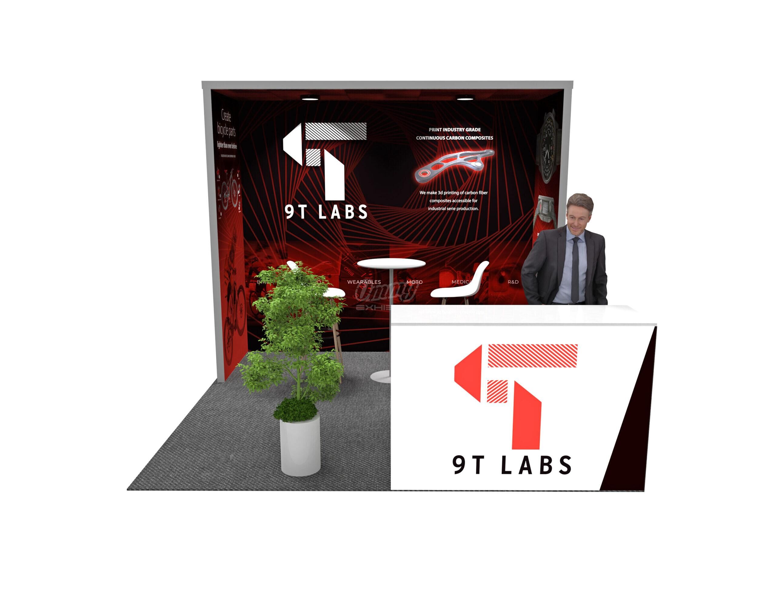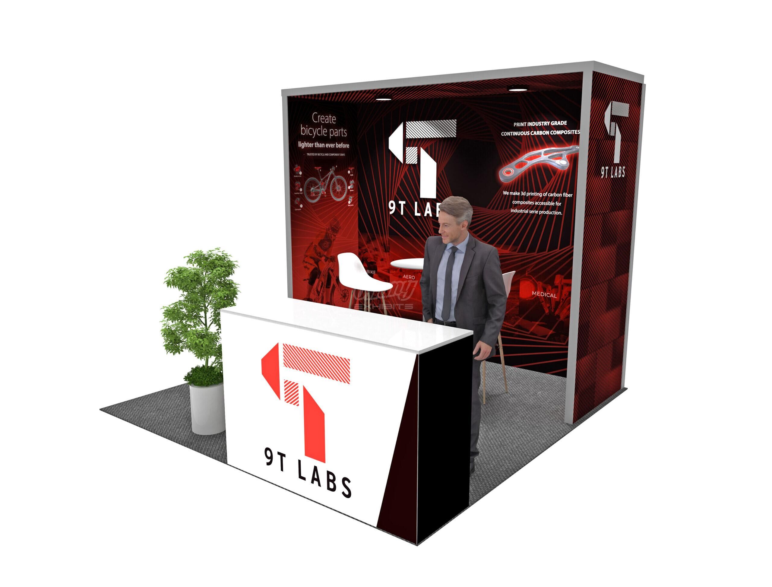 Need a 10×10 exhibit booth rental with a more open feel? This design features a full-color back wall with partial side walls that frame your space without boxing it in completely. Down lights keep your messaging bright and visible, while the bar-height table with two stools creates an approachable spot for quick conversations or casual demos. The large reception cabinet gives you plenty of room to stash materials and personal items out of sight. It’s a smart layout for exhibitors who want defined space with better sightlines – you stay visible to passersby while still having structure and storage where you need it.