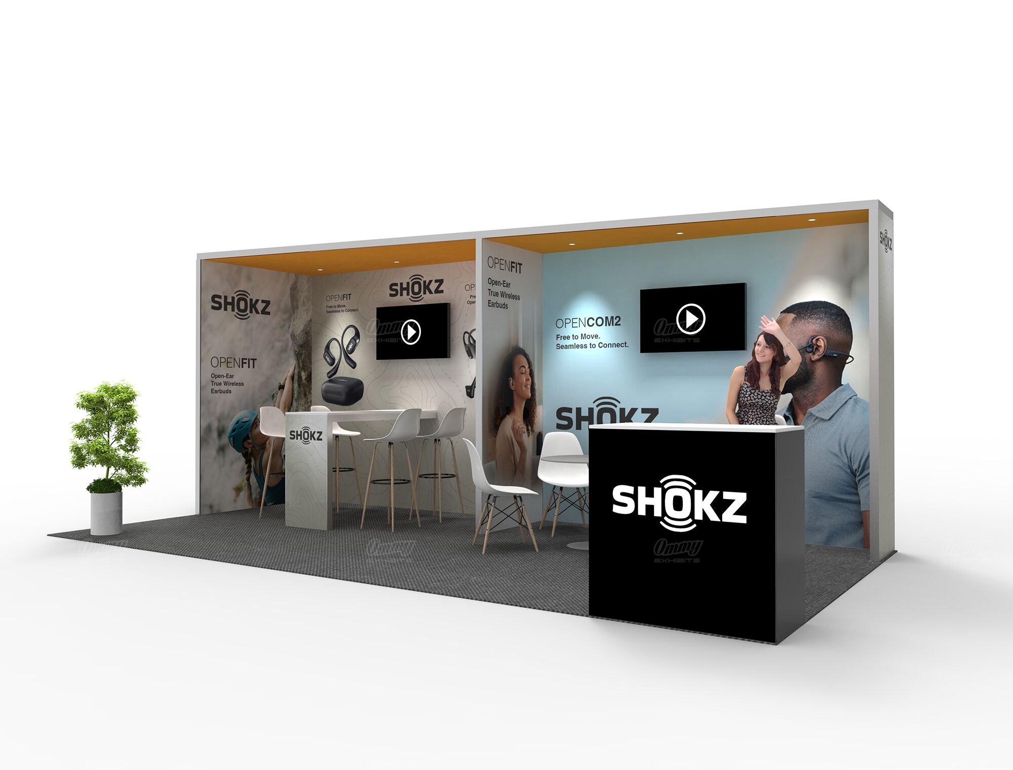 Need a 10×20 booth rental that handles different conversation types? This design features a split back wall that creates two distinct zones, backed by dual video displays for versatile content presentation. You’ve got a built-in table for quick interactions and a proper conference table for more serious sit-down meetings. The reception keeps everything organized between conversations. It’s a smart layout for exhibitors who need flexibility—casual chats happen at the built-in table while qualified prospects get the full treatment at the conference setup, all within the same footprint.