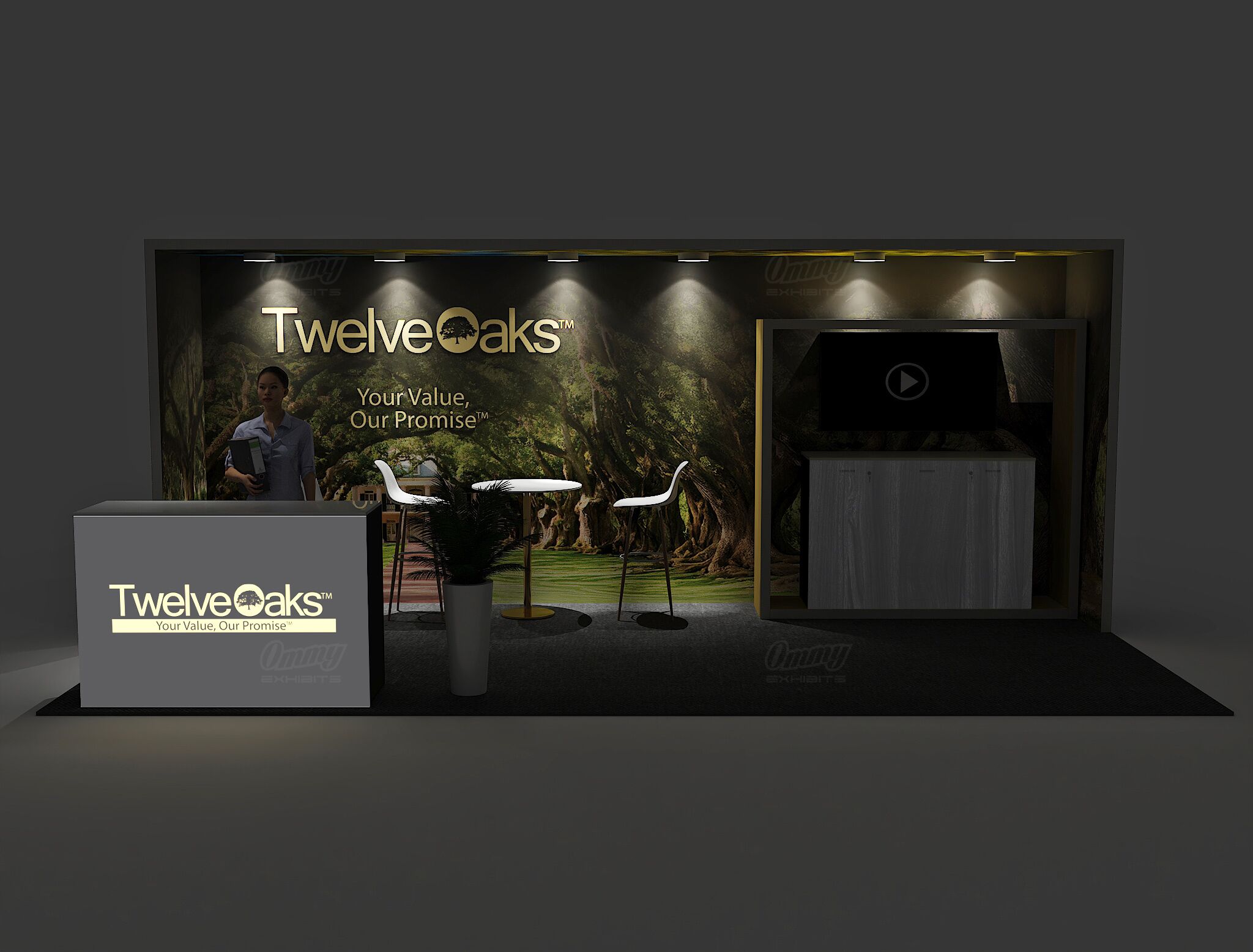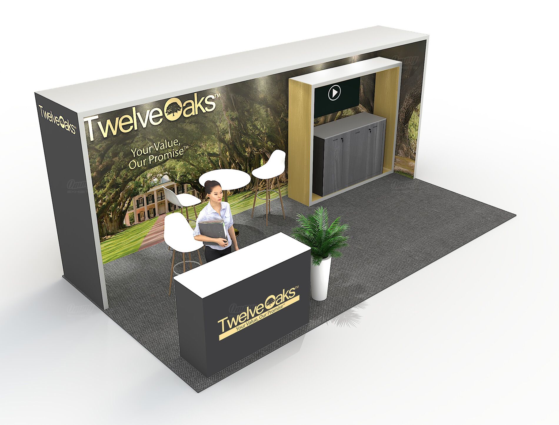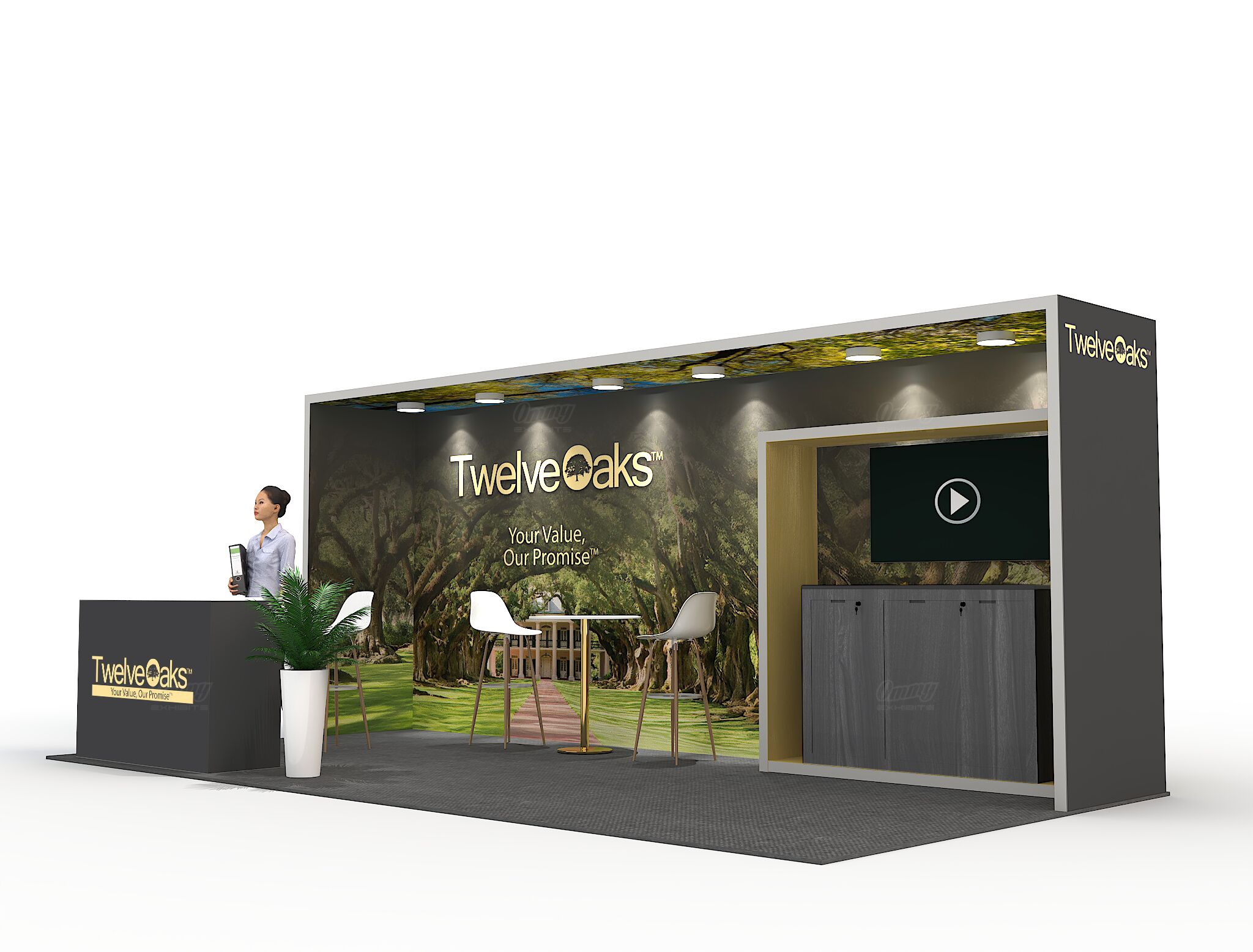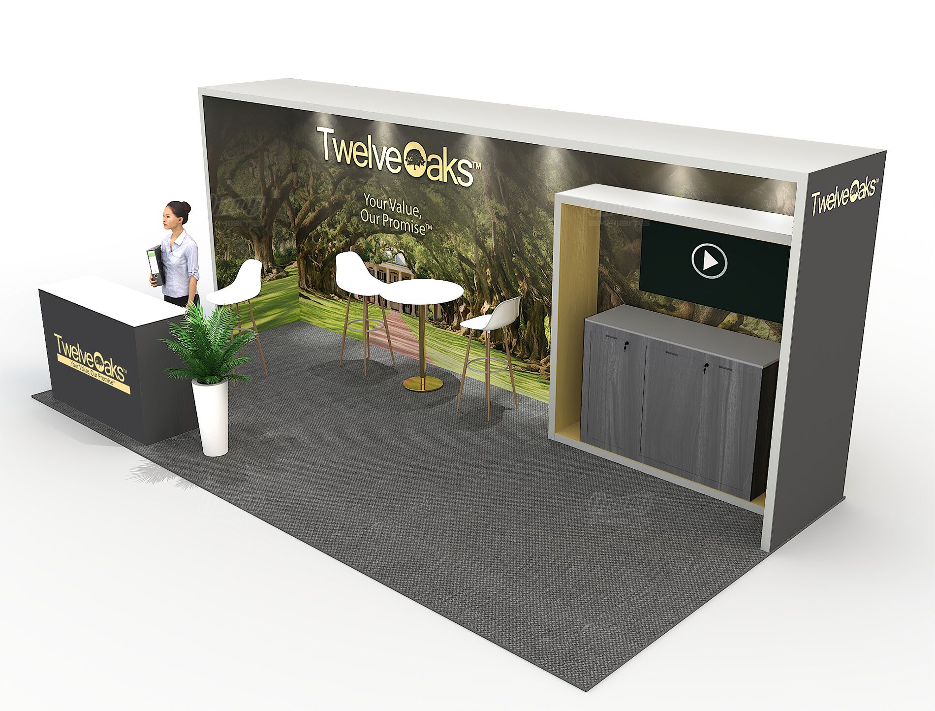 Need a 10×20 booth rental that’s straightforward and effective? This design gives you a video display to showcase dynamic content, a bar-height table with three stools for engaging conversations, and smart storage solutions to keep everything organized. The illuminated reception adds a polished glow that elevates the whole space. It’s a solid, no-nonsense setup that covers all the basics you need to work a show effectively—good flow, proper seating, and that professional presence that makes attendees feel comfortable stopping by to learn more.