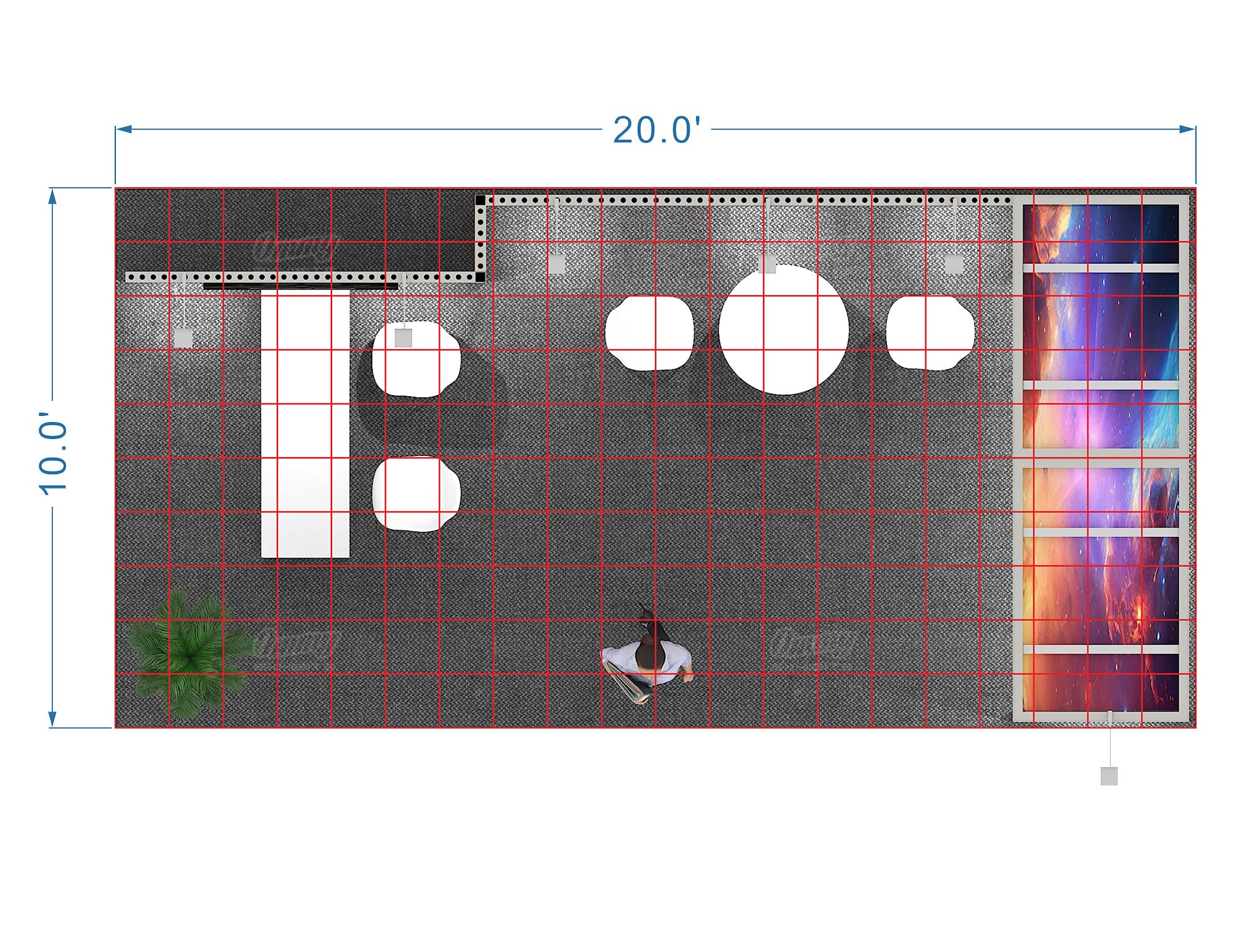Need a 10×20 booth rental with room to breathe? This design features dual video displays for dynamic content presentation, a built-in desk for working demos or paperwork, and a bar-height table for casual conversations. The extended ceiling adds visual height and helps define your space on a crowded show floor—it’s that finishing touch that makes your booth feel more substantial and polished. It’s a versatile layout that gives you multiple work zones, so you can handle different types of interactions simultaneously without people feeling like they’re stepping on each other’s toes.