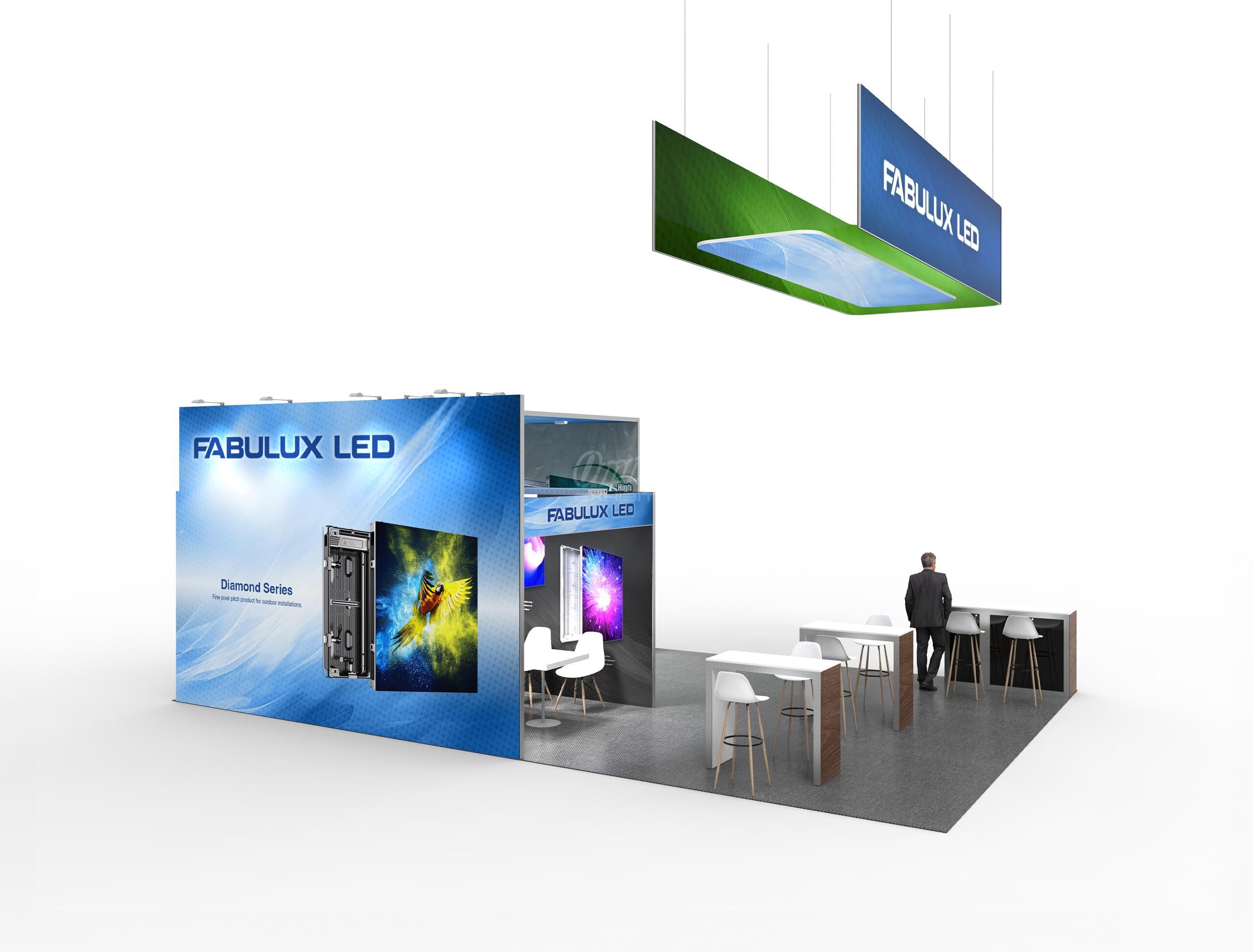 Create a professional and focused atmosphere with this functional 20×30 island exhibit. This booth achieves superior visibility with a commanding two-tiered hanging sign and provides a defined aesthetic through a ceiling with down lights, creating a polished environment. The layout is optimized for focused client interaction, featuring a partially enclosed meeting space that offers privacy without feeling sealed off. Casual discussions are accommodated by two bar tables. The structure includes a dedicated storage structure, ensuring the entire space remains organized and clutter-free.