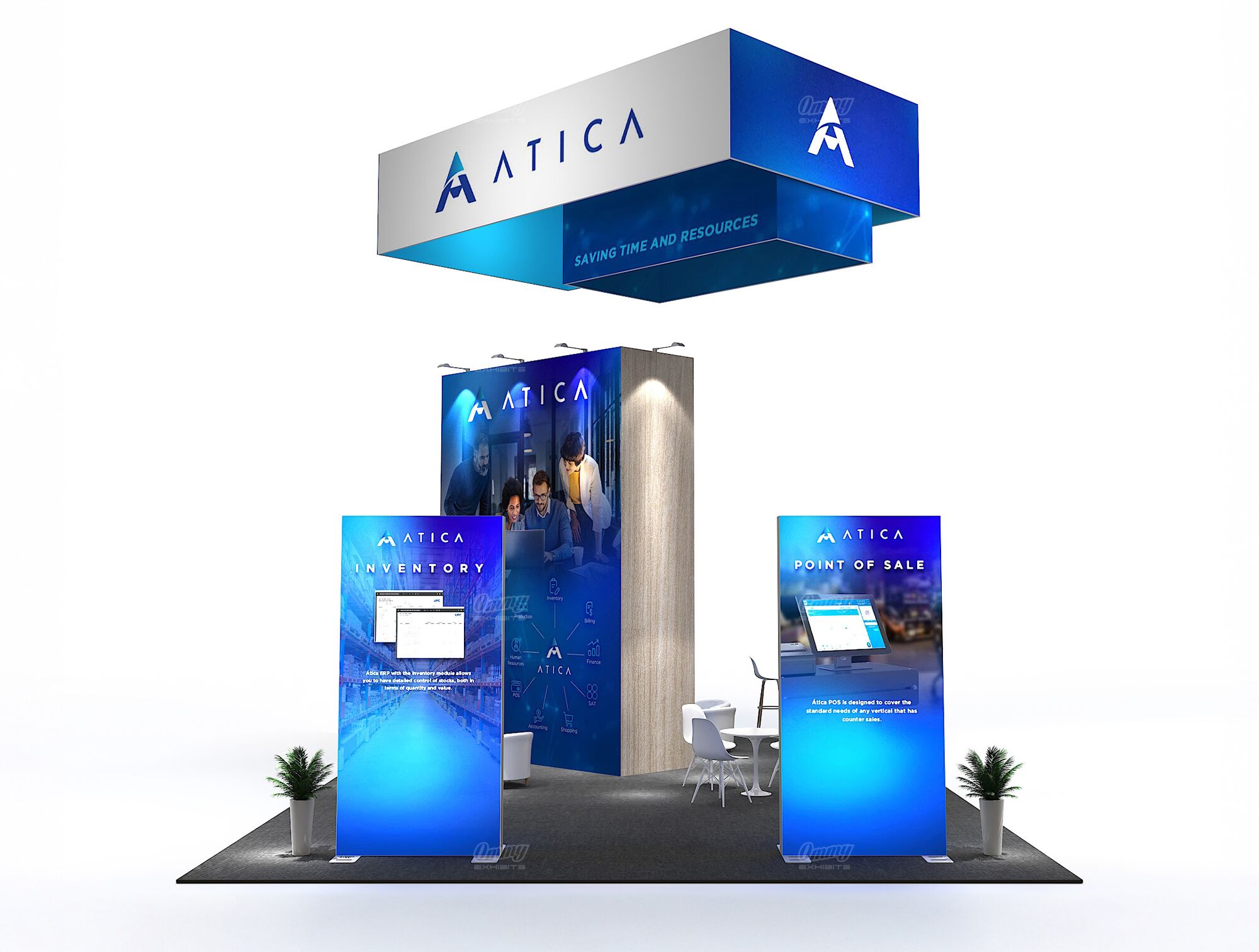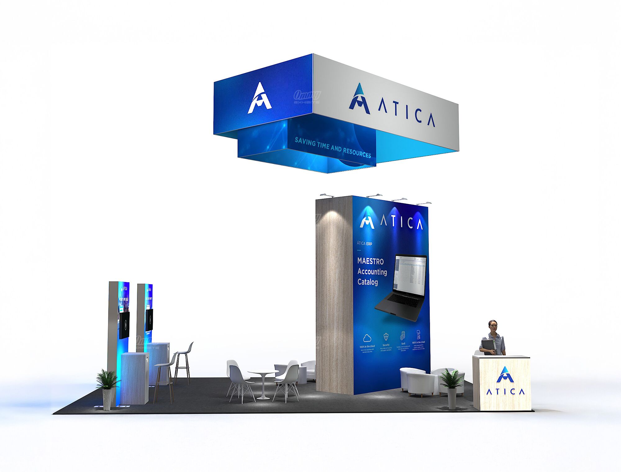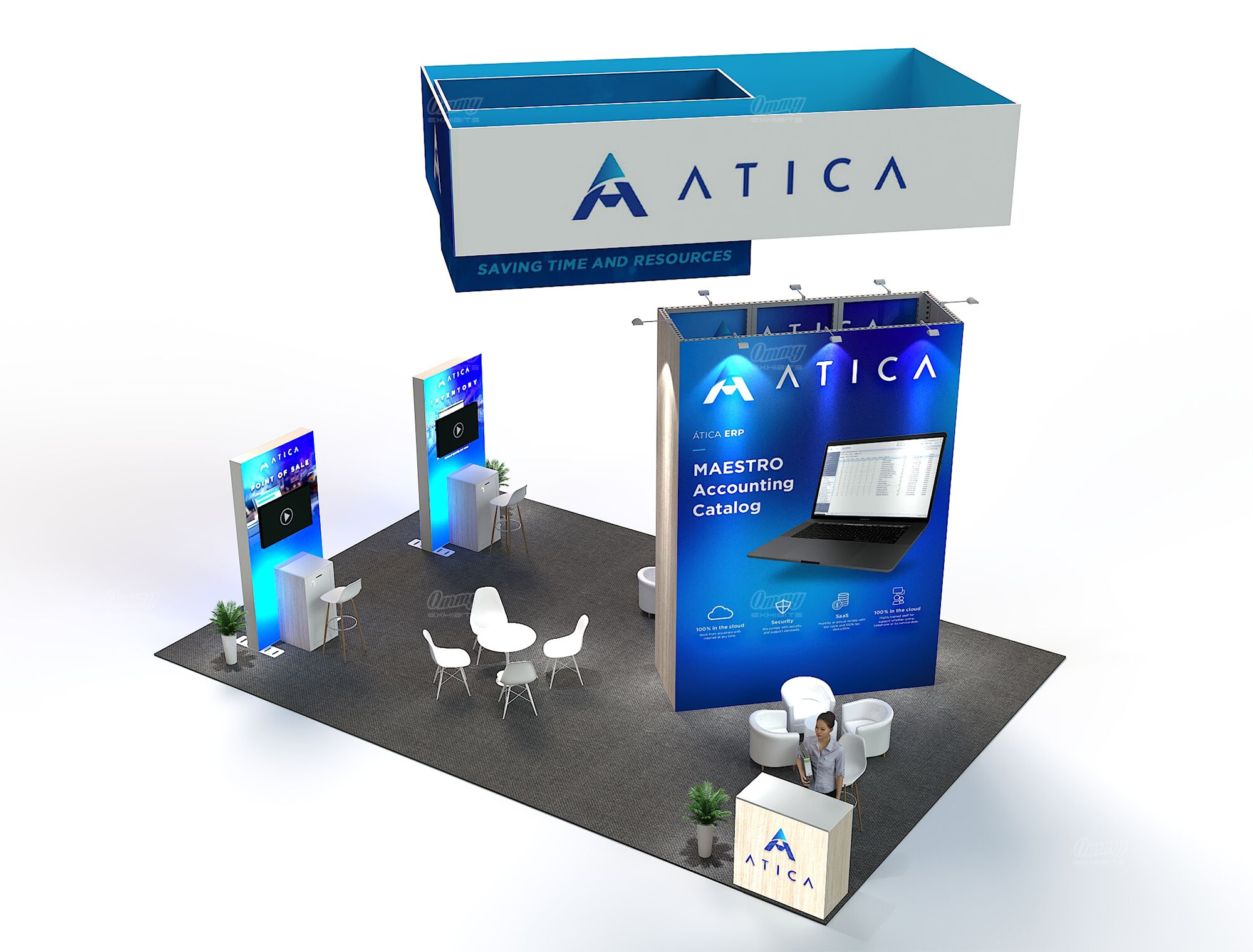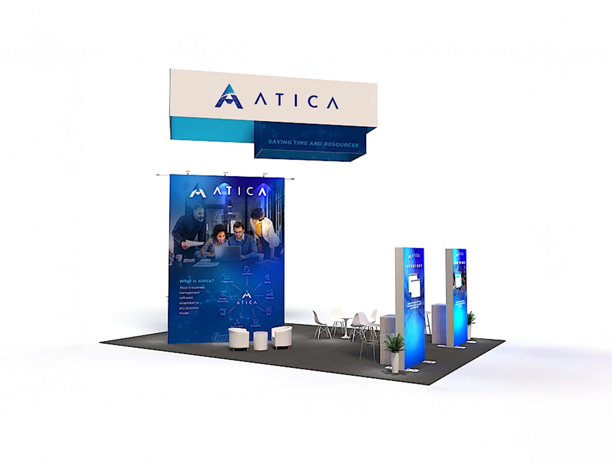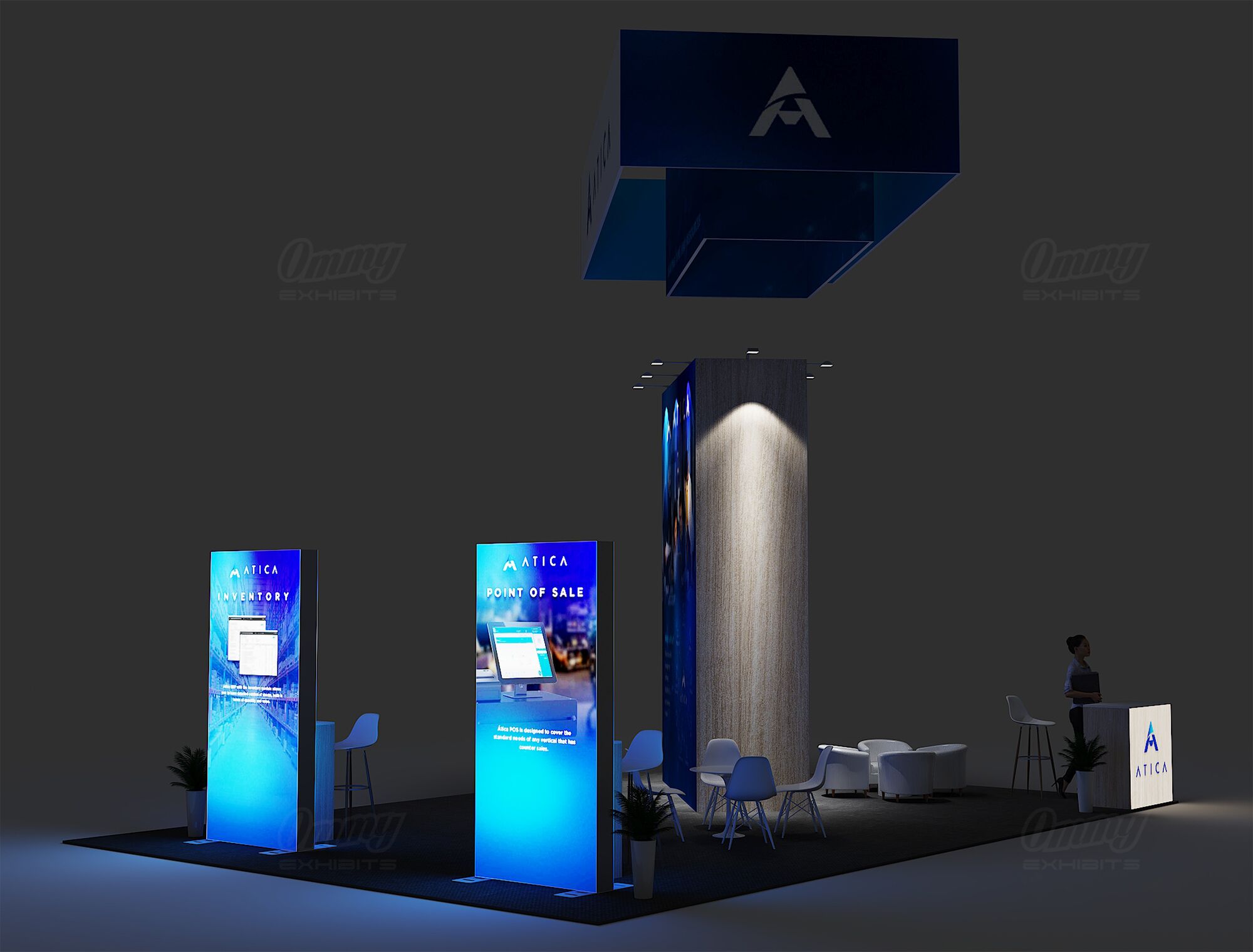 Project a balanced and professional image with this symmetrical 20×30 island exhibit. This booth is designed for efficiency and high visibility, anchored by a central graphic tower that provides a striking visual focal point. Content is delivered effectively via presentation monitors integrated throughout the space. The layout features multiple reception counters to manage high traffic from all directions, complemented by various casual seating zones for comfortable, informal client discussions. This solution offers excellent flow, visual balance, and high-capacity interaction.