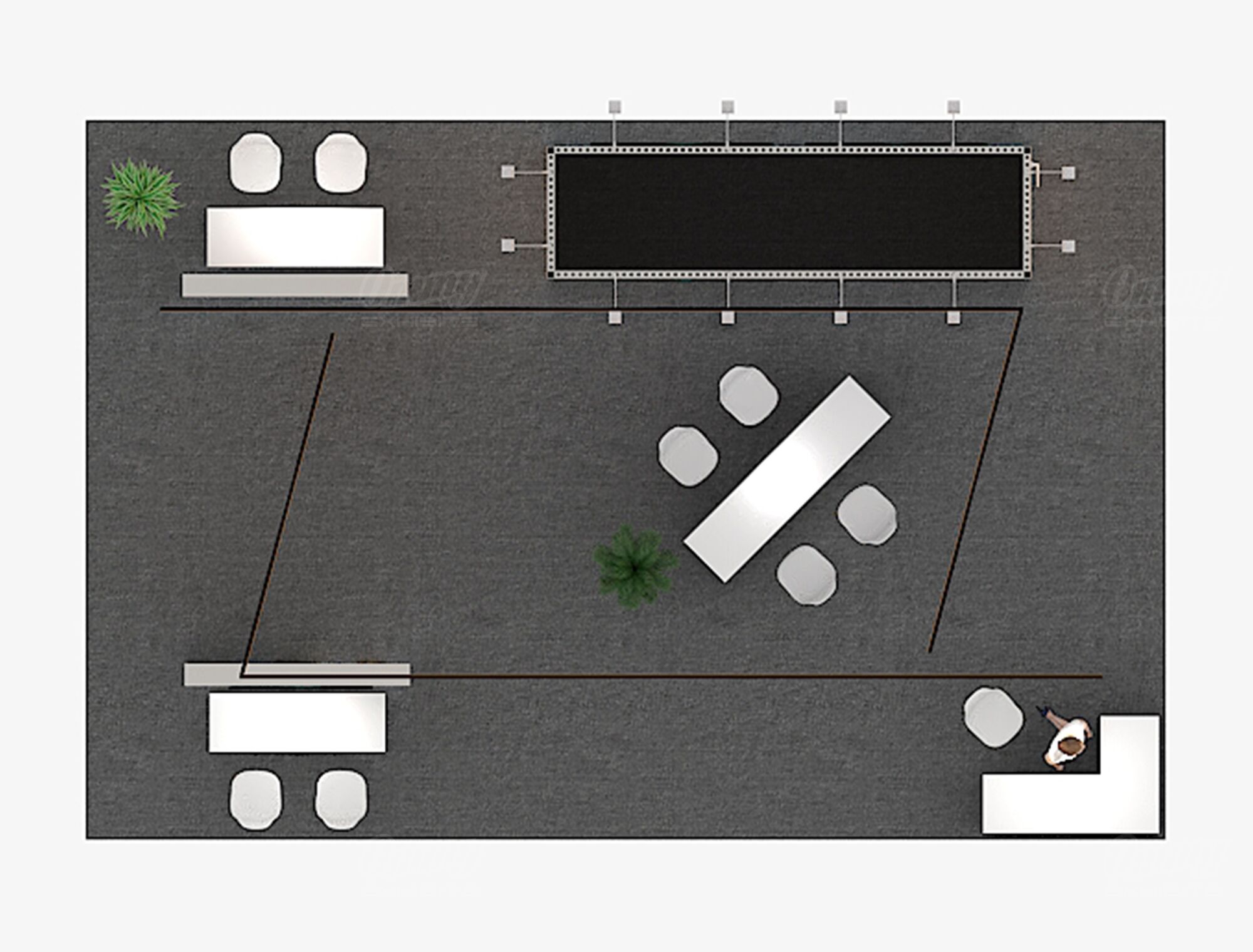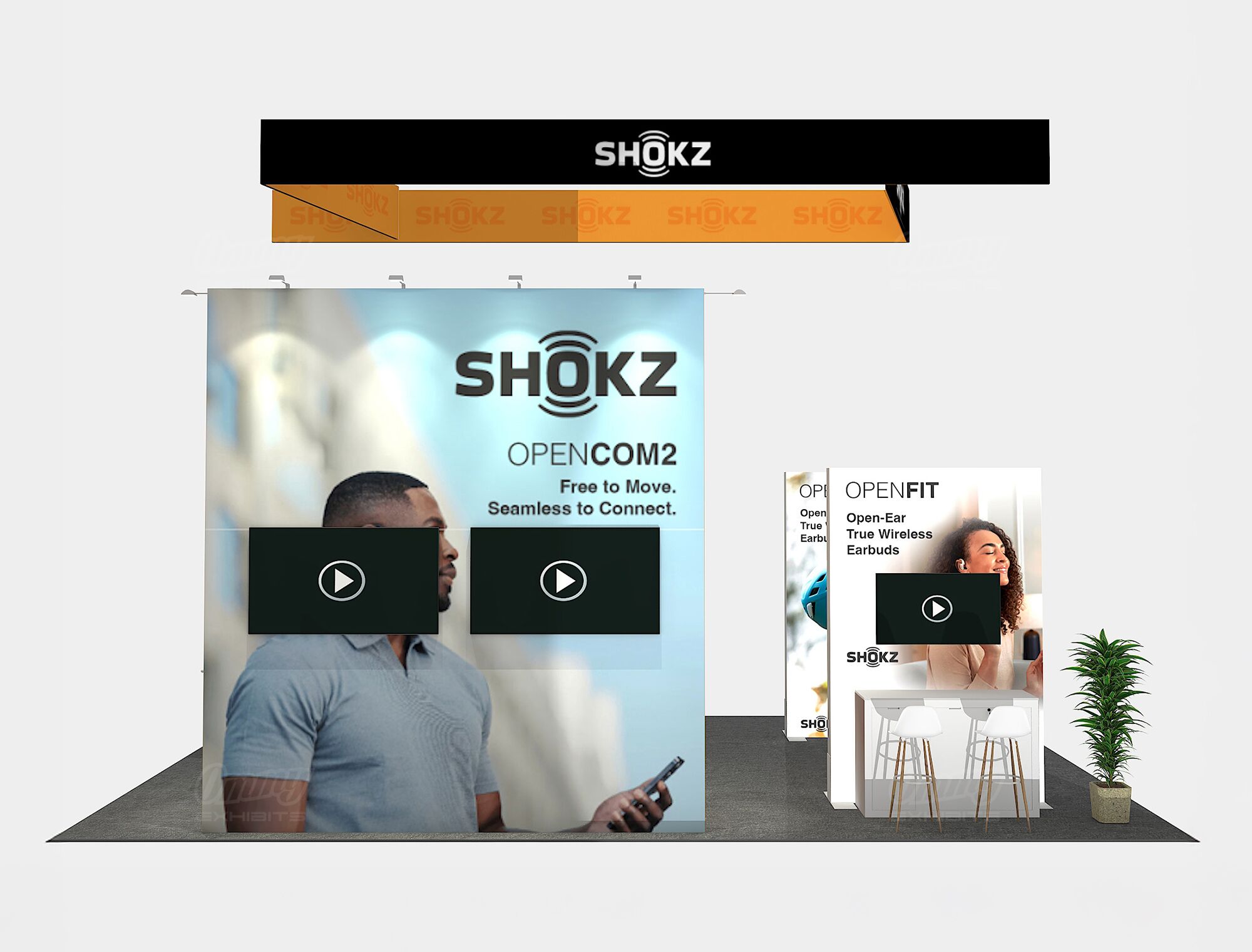 Command attention with this structured and technology-ready 20×30 island exhibit. This booth ensures superior visibility with a striking angular hanging sign and is anchored by a functional central storage structure. Content delivery is impactful with two integrated video displays, complemented by two light box stations for brilliant graphics. Client engagement is facilitated by a tall meeting table, perfect for quick, focused discussions. This solution effectively combines strong architecture, ample storage, and advanced presentation capabilities.