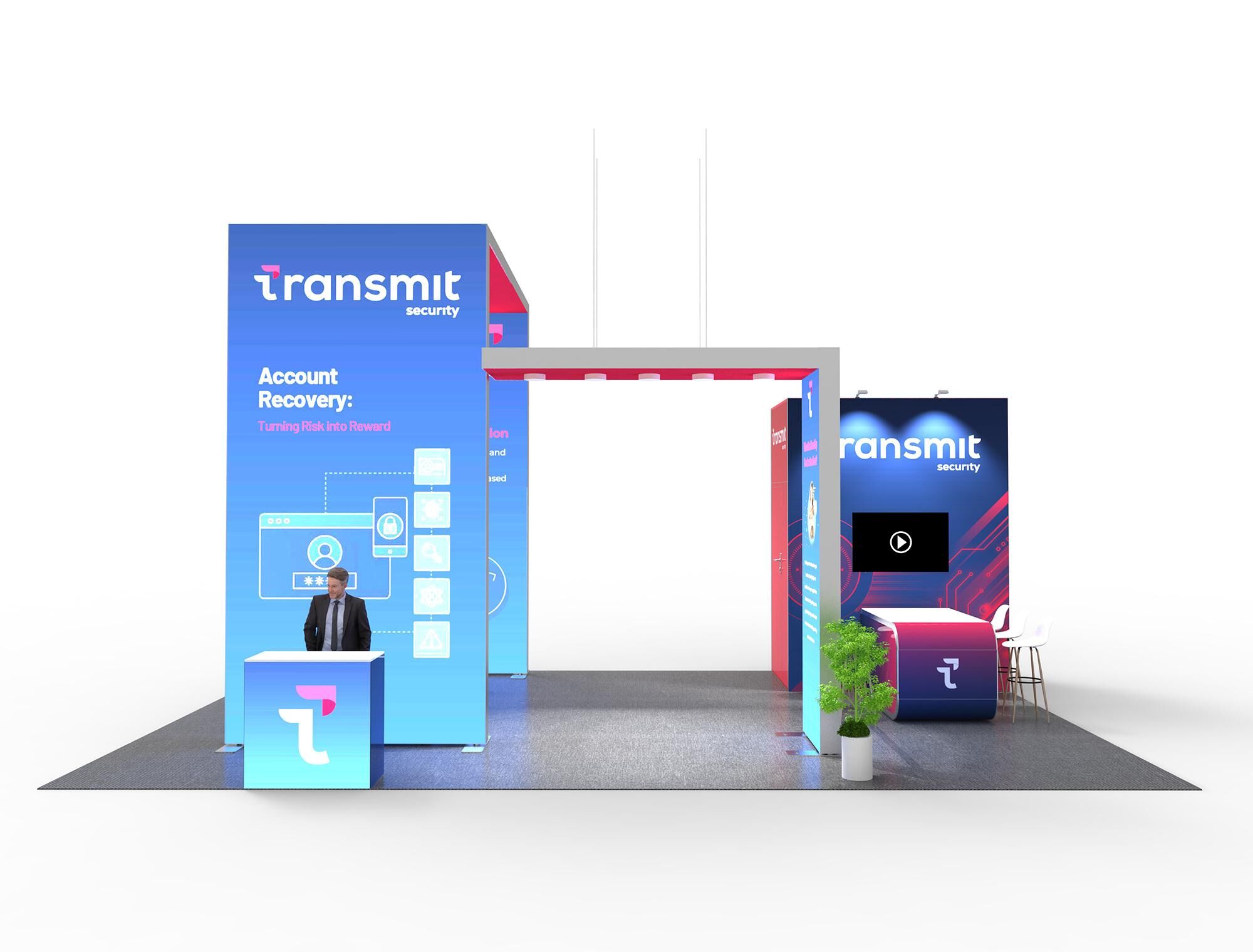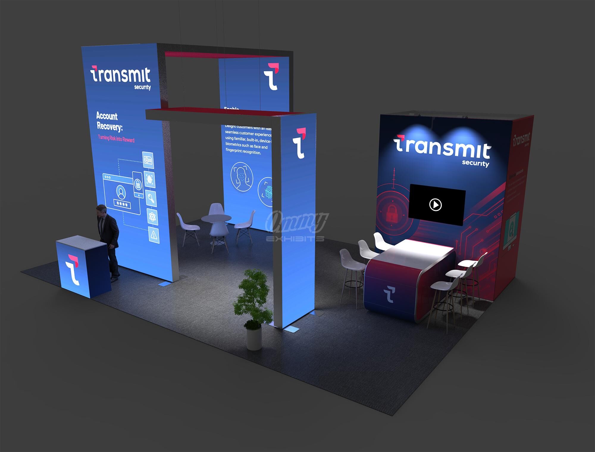 Make a visually striking statement with this contemporary 20×30 island exhibit. This booth achieves sophisticated dimension with a dramatic, tall light box arch and a defining L-shaped ceiling structure. Engagement is comfortable, and capacity is high, featuring a central curved table accompanied by six stools for casual client meetings. A dedicated reception counter efficiently manages incoming visitors, and a private storage room ensures the entire space remains clean and professional.