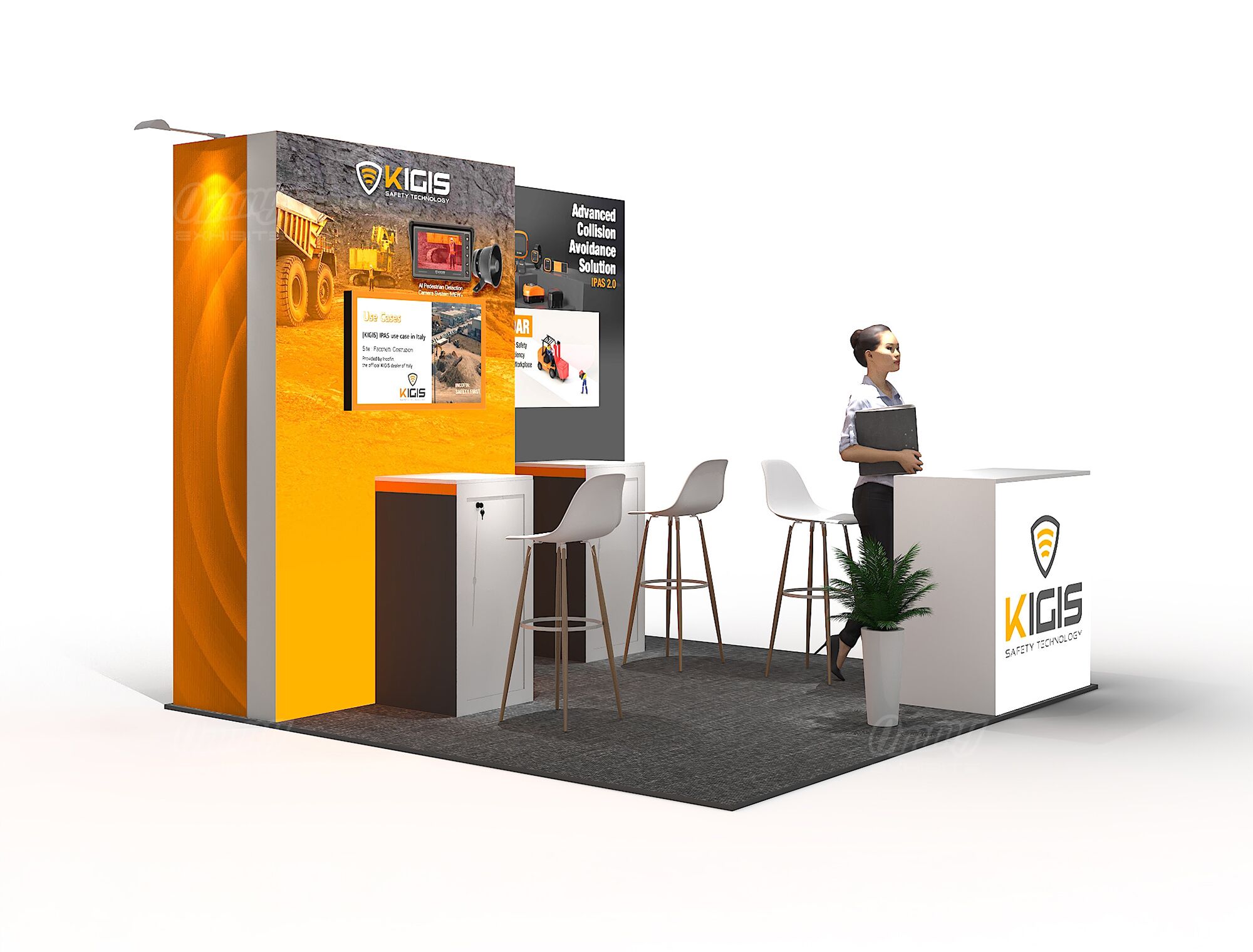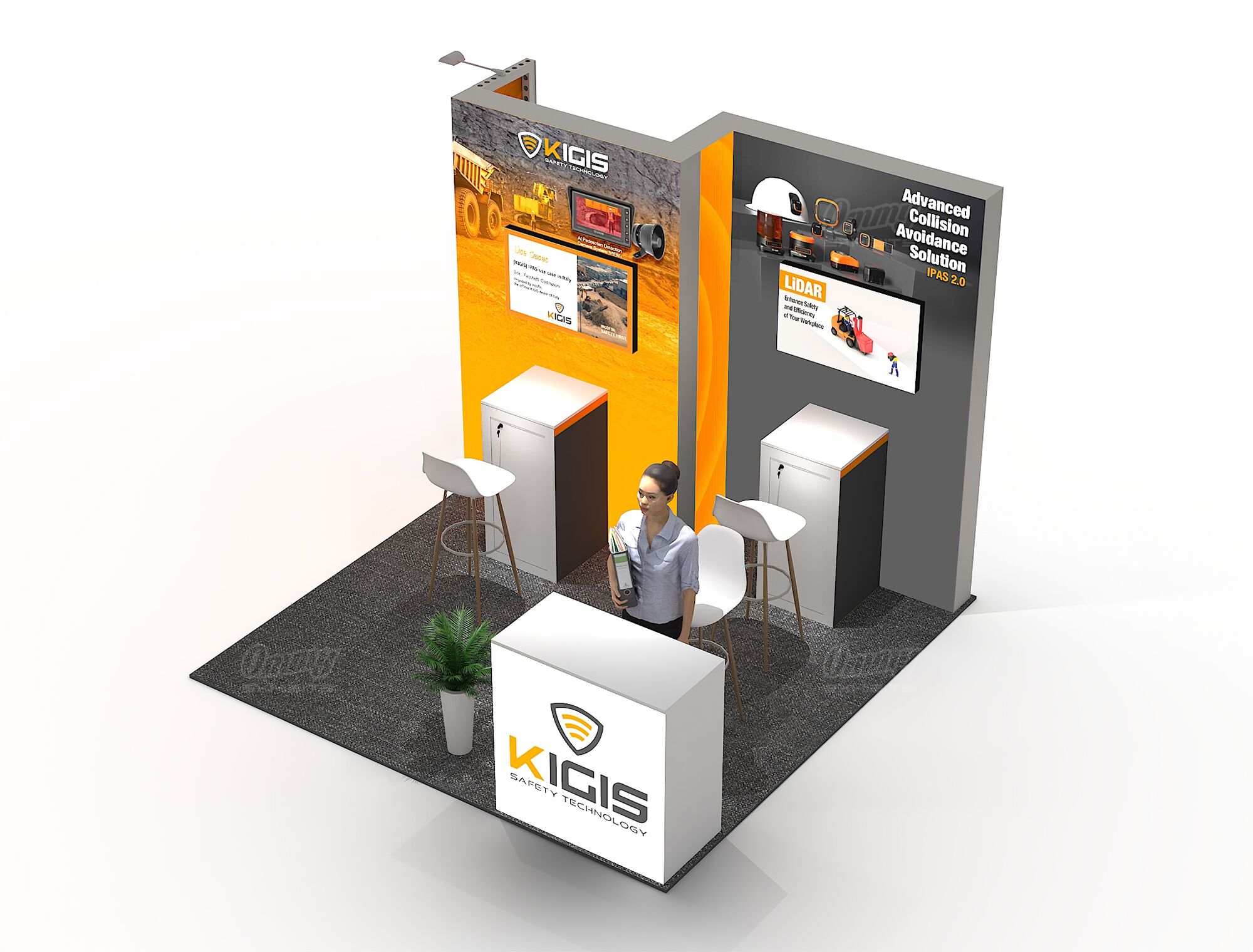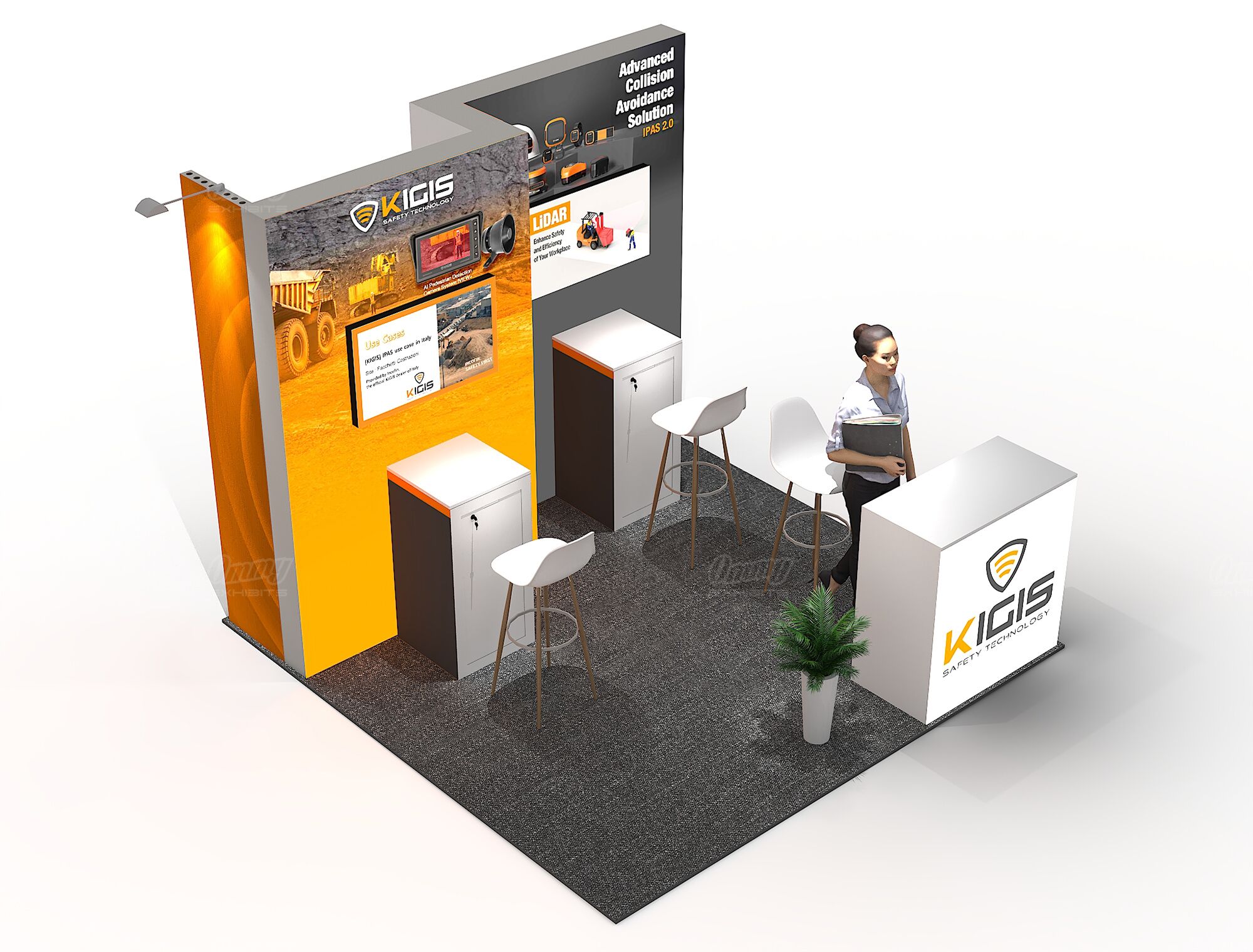 This design features stepped full-color illuminated back walls that create eye-catching dimension and depth, making your brand stand out from every angle on the show floor. Two showcase cabinets with accompanying stools provide dedicated display space for your products while inviting attendees to sit, stay, and engage with what you’re offering. The reception cabinet keeps materials organized and accessible when you need them. It’s a product-focused configuration that balances dramatic visual impact with practical merchandising—ideal for exhibitors who want to showcase offerings in an inviting, professionally lit environment.