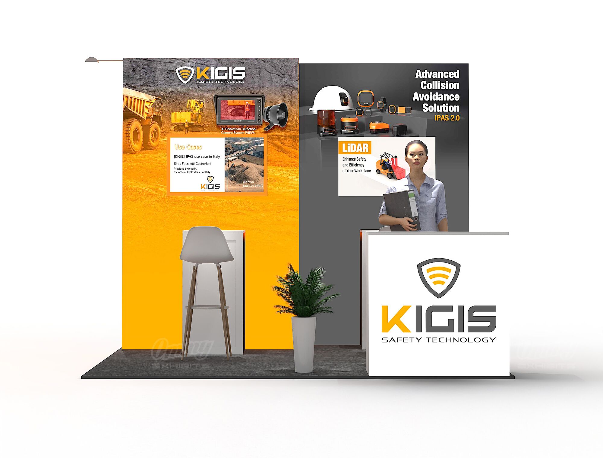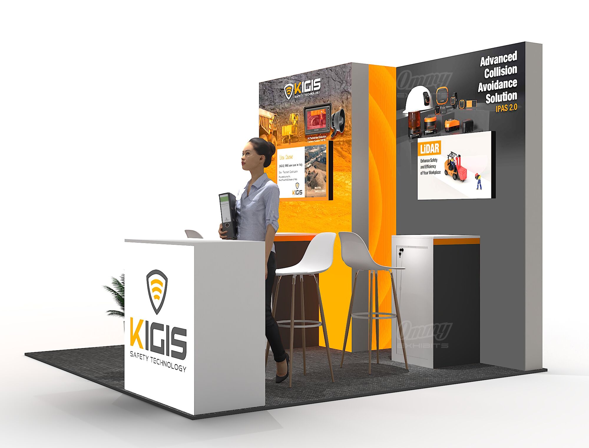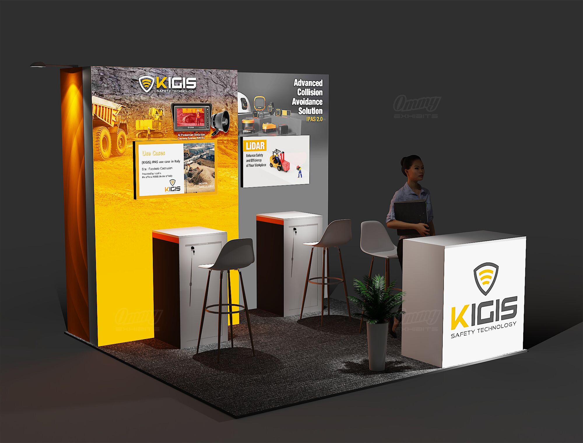 This design features stepped full-color illuminated back walls that create eye-catching dimension and depth, making your brand stand out from every angle on the show floor. Two showcase cabinets with accompanying stools provide dedicated display space for your products while inviting attendees to sit, stay, and engage with what you’re offering. The reception cabinet keeps materials organized and accessible when you need them. It’s a product-focused configuration that balances dramatic visual impact with practical merchandising—ideal for exhibitors who want to showcase offerings in an inviting, professionally lit environment.