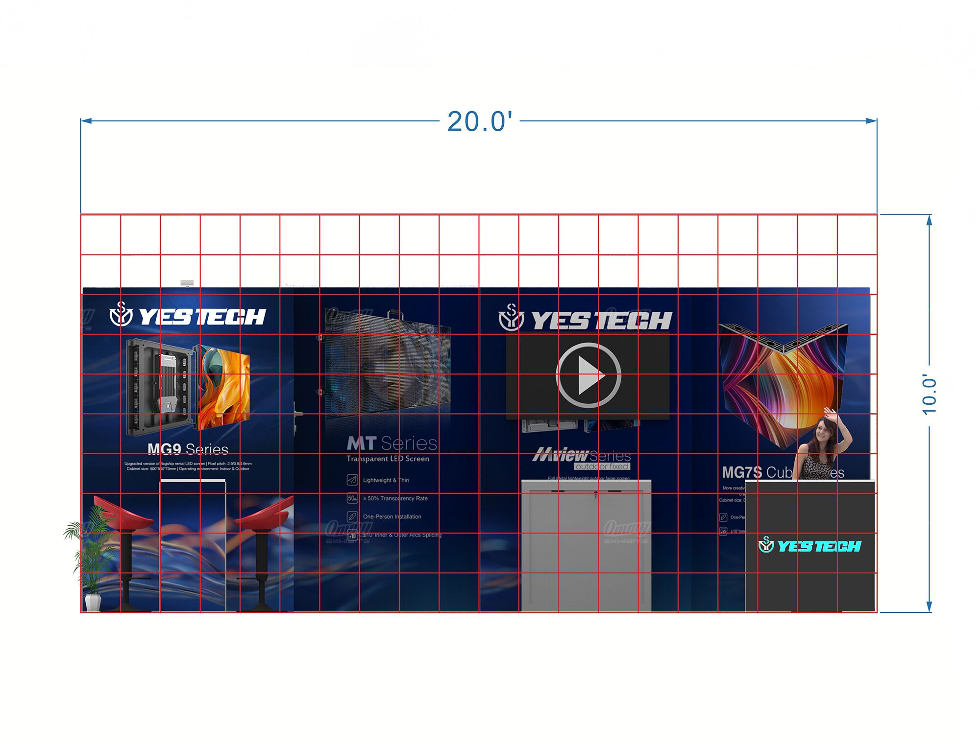Need a 10×20 booth rental with some serious functionality? This design features an actual storage room where you can stash coats, boxes, and extra materials out of sight, plus a double-sided bar desk with four stools that lets you work both sides simultaneously. The video display keeps content front and center, while the reception area gives you a professional home base. It’s perfect for exhibitors who bring a lot to shows or have multiple team members working—the storage room alone is a game-changer when you need to keep your booth looking clean all day long.