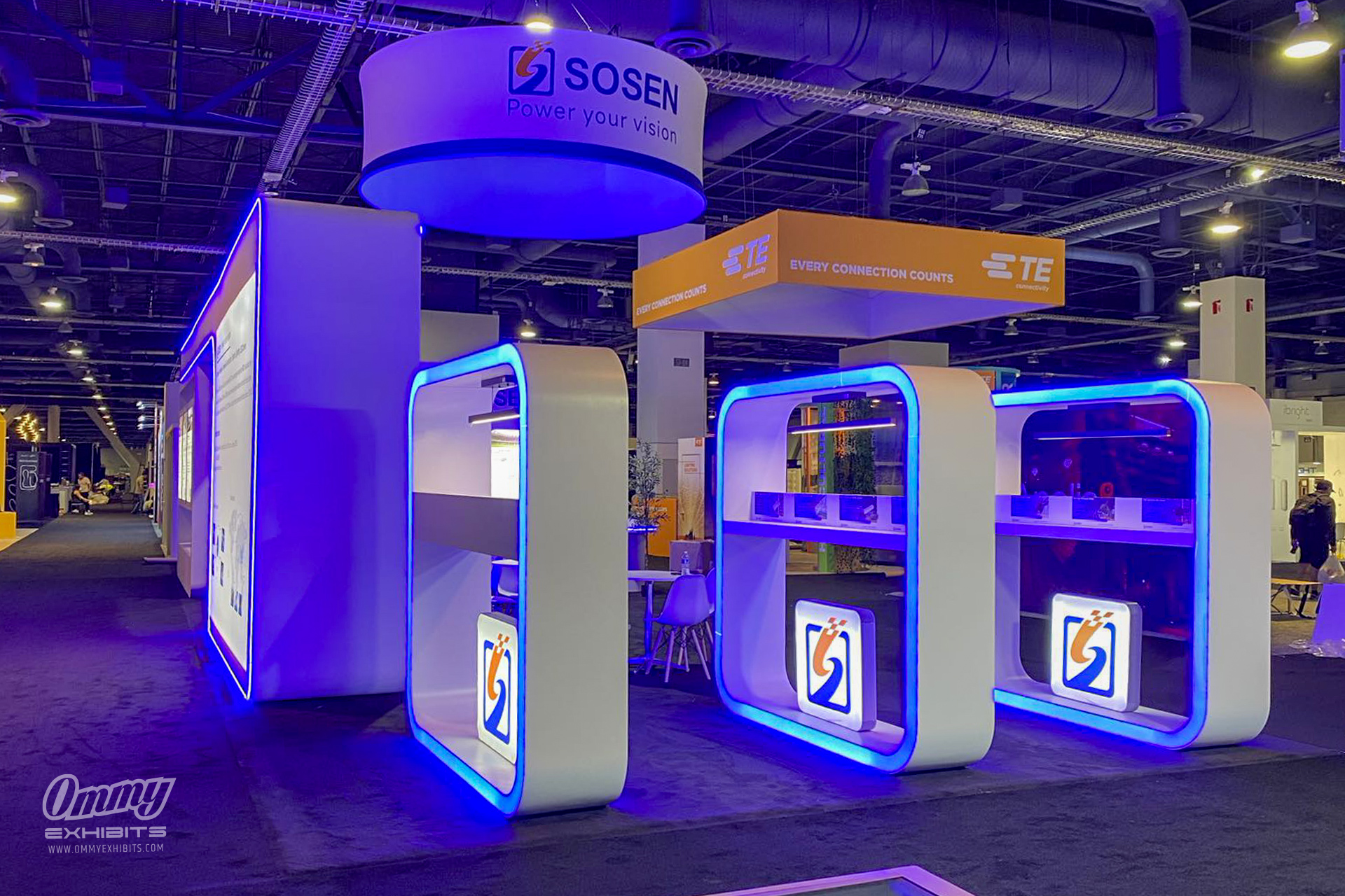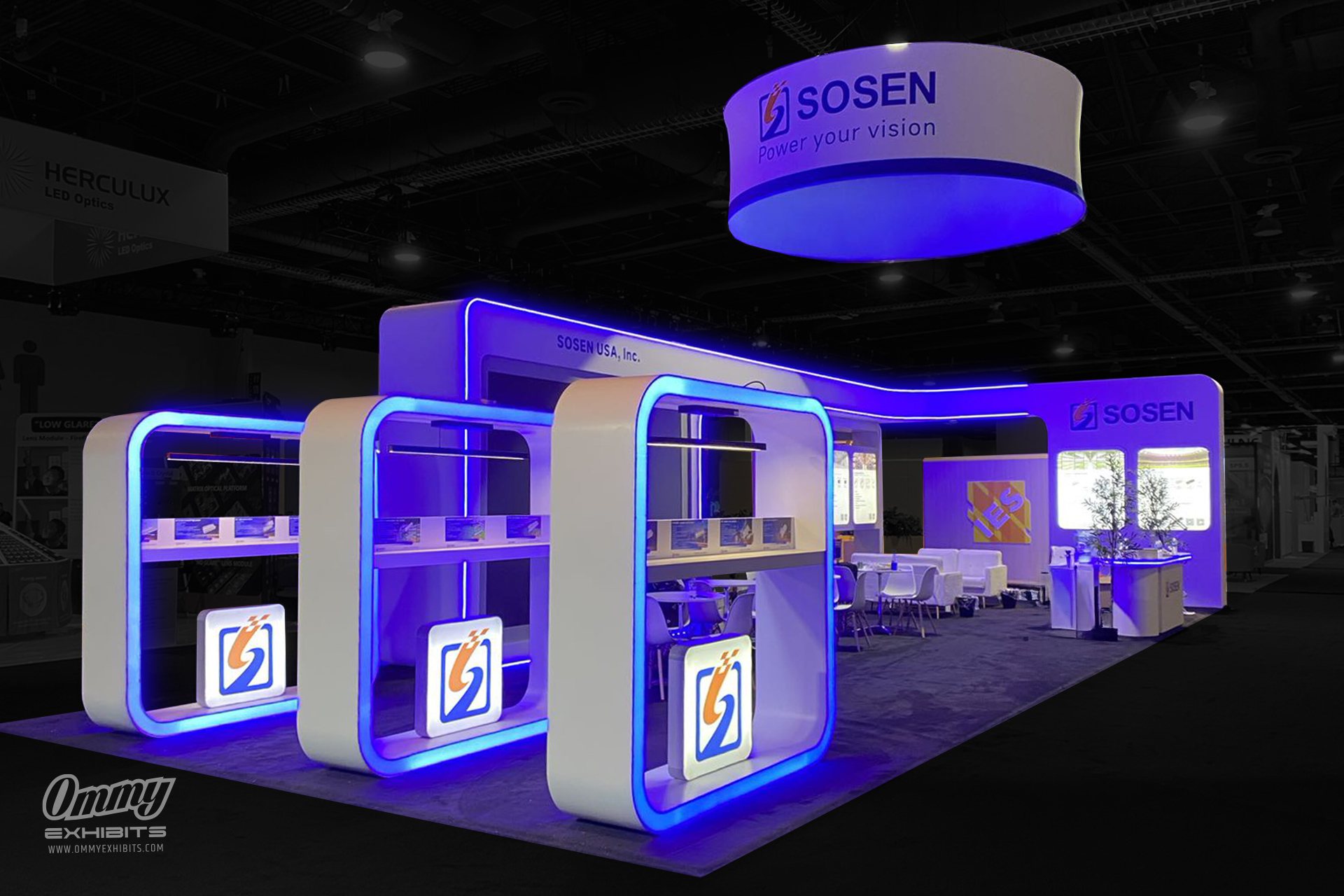 LightFair 2025 attendees witnessed an exceptional modern trade show booth design from SOSEN. Their expansive 50’x20′ exhibition space impressed all visitors. The futuristic booth featured neon blue lights throughout. Vibrant backlit displays enhanced the visual appeal. This design showcased how contemporary principles create unforgettable brand experiences. The booth balanced visual impact with practical functionality. Casual couches provided comfortable seating options. Tables and chairs created dedicated meeting areas for conversations. The entire installation radiated energy. SOSEN’s distinctive orange and blue emblem served as a perfect focal point. This display represented a masterclass in modern trade show booth design. Attendees consistently praised the thoughtful layout and aesthetic appeal.